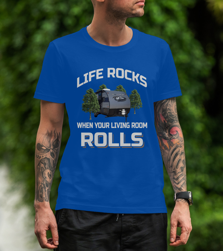 The LIFE ROCKS WHEN YOUR LIVING ROOM ROLLS WOLF PUP T-shirt is designed for everyday wear and a consistent fit. Fabric is pre-shrunk ring-spun cotton with durable stitching. See the size chart below for exact measurements.