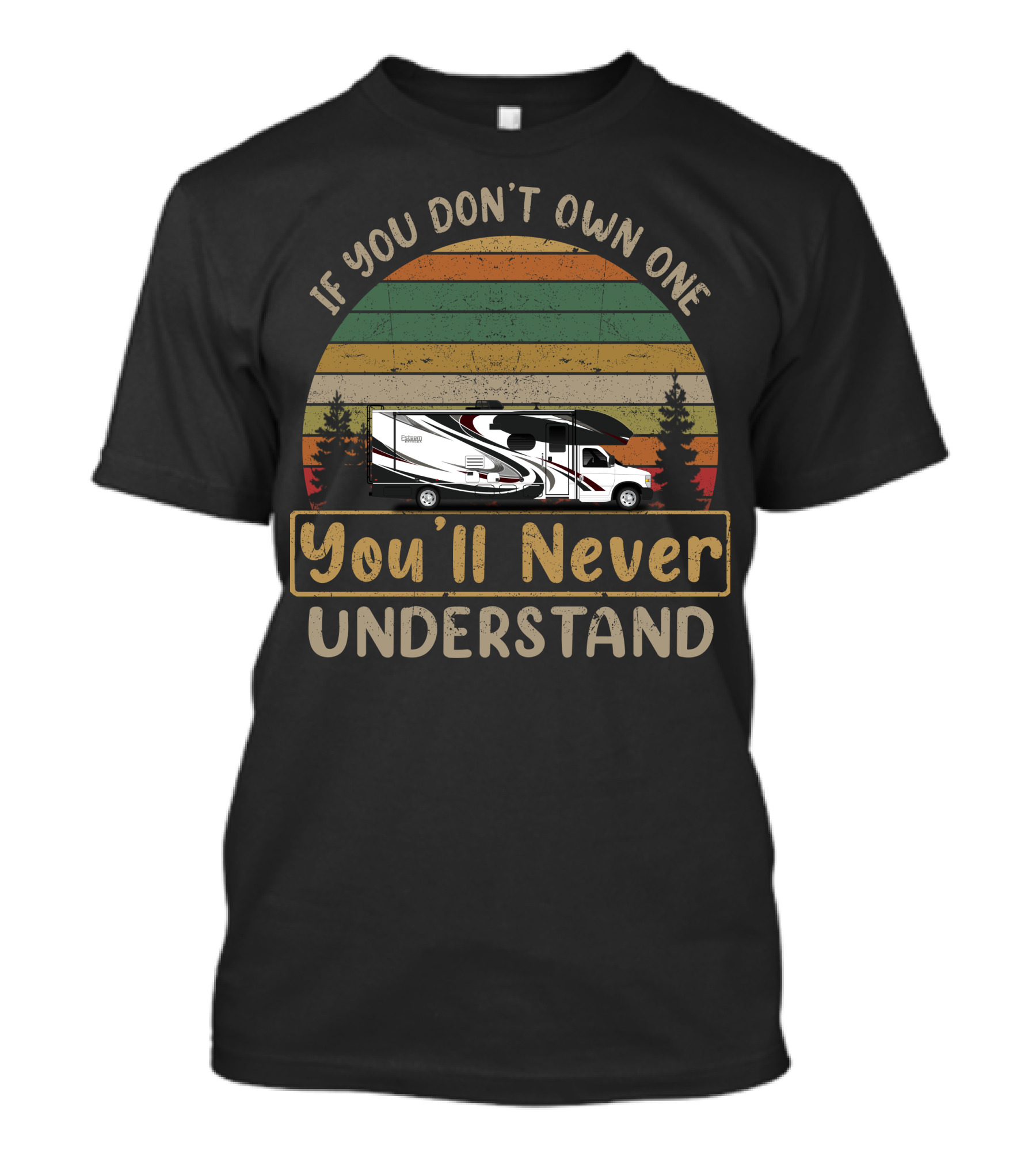 The If You Don't Own One You'll Never Understand Entegra Esteem 29V Retro RV Scene T-shirt is designed for everyday wear and a consistent fit. Fabric is pre-shrunk ring-spun cotton with durable stitching. See the size chart below for exact measurements.