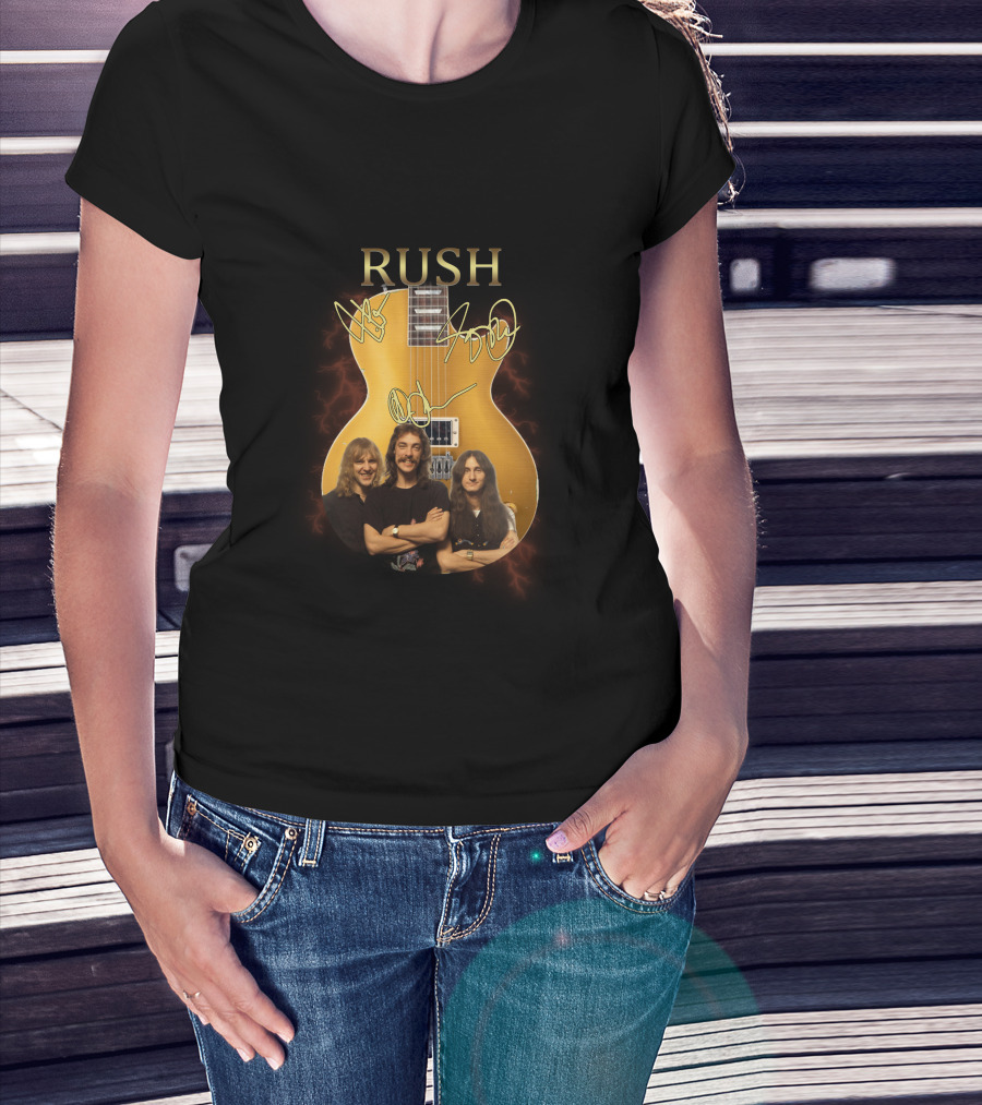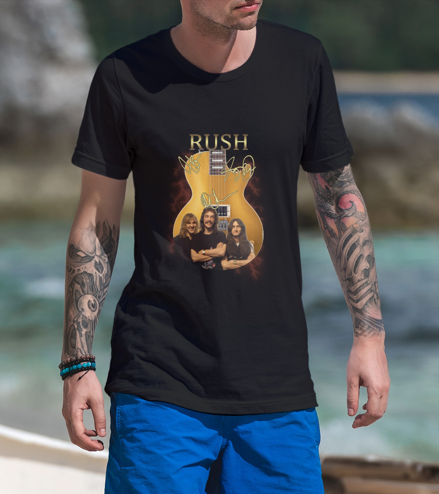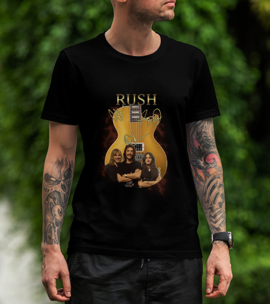 How much will this Rush Signature Guitar with Band Members and Autographs shirt shrink?