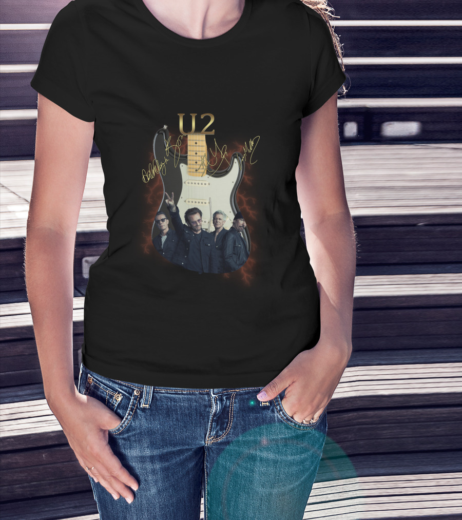 U2 Signed Electric Guitar With Band Image T-Shirt