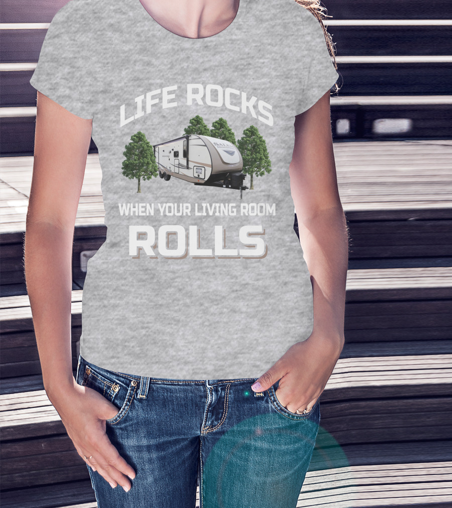 LIFE ROCKS WHEN YOUR LIVING ROOM ROLLS Forest River Hemisphere Trailer T-Shirt