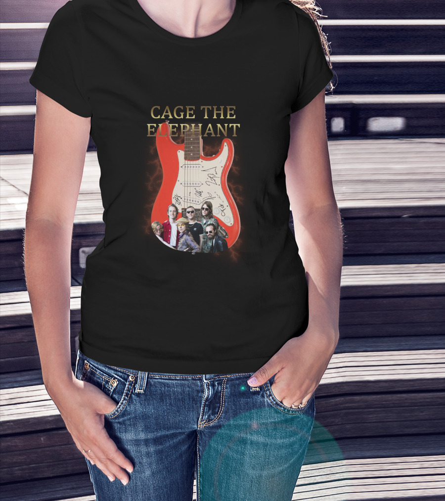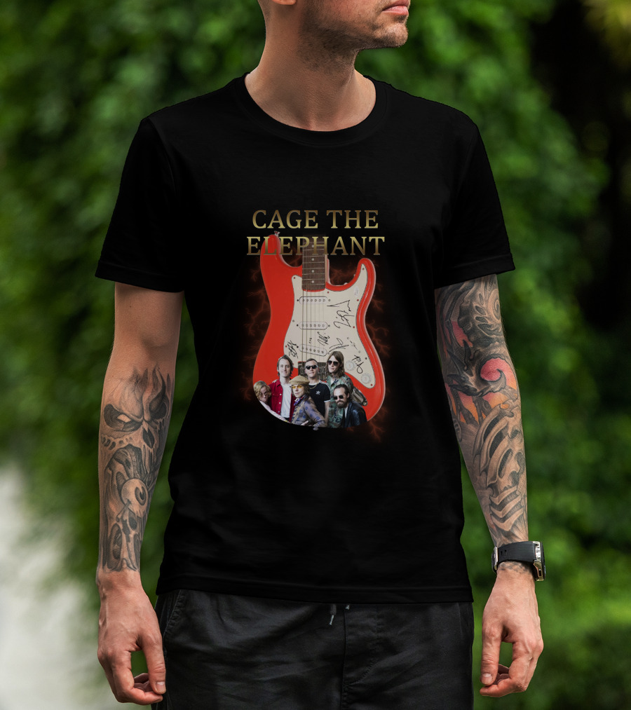 The Cage The Elephant Red Electric Guitar Signatures and Band Montage T-shirt is designed for everyday wear and a consistent fit. Fabric is pre-shrunk ring-spun cotton with durable stitching. See the size chart below for exact measurements.