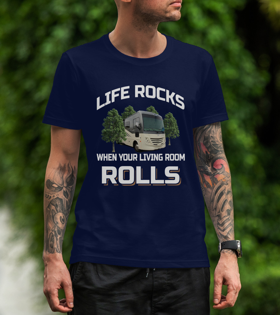 The LIFE ROCKS WHEN YOUR LIVING ROOM ROLLS Fleetwood Flair T-shirt is designed for everyday wear and a consistent fit. Fabric is pre-shrunk ring-spun cotton with durable stitching. See the size chart below for exact measurements.