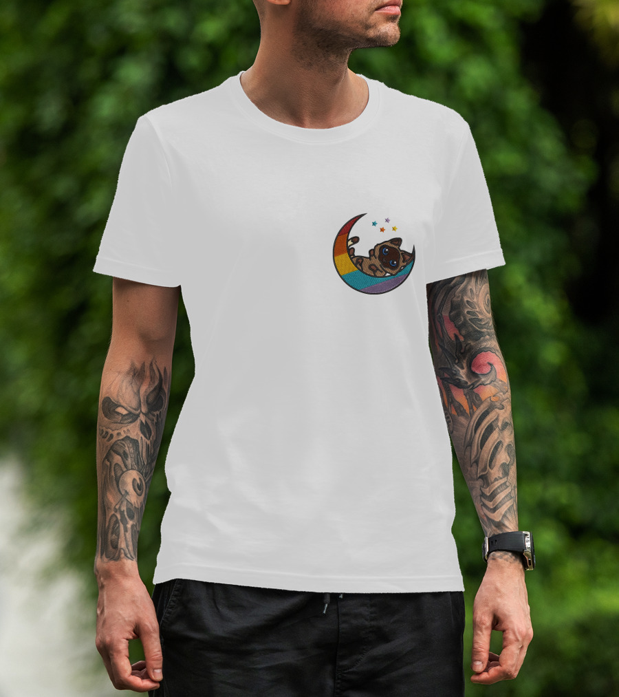 The Notantfrost X Dream Merch Perfectly Impurrfect Rainbow Crescent Cat with Stars T-shirt is designed for everyday wear and a consistent fit. Fabric is pre-shrunk ring-spun cotton with durable stitching. See the size chart below for exact measurements.