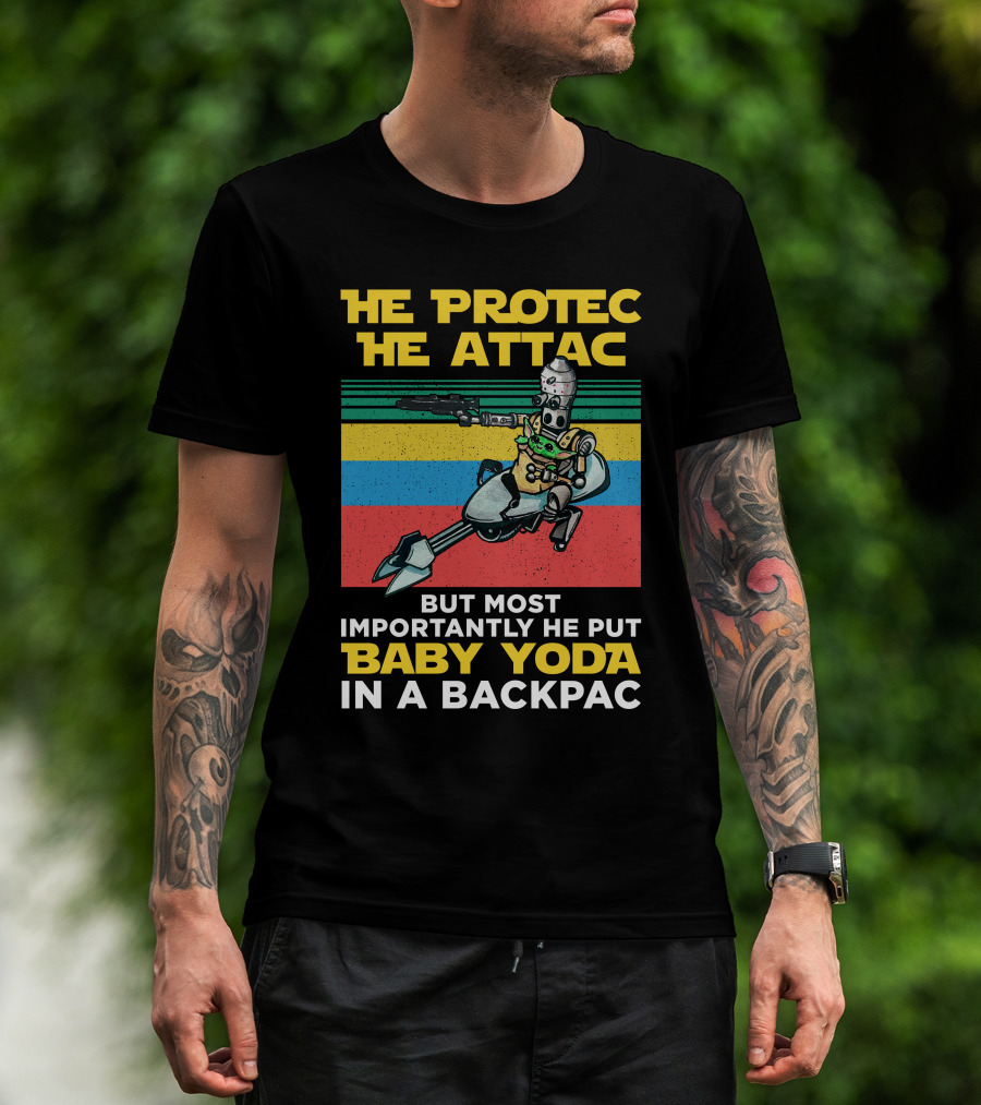 The He Protec He Attac But Most Importantly He Put Baby Yoda in a Backpac T-shirt is designed for everyday wear and a consistent fit. Fabric is pre-shrunk ring-spun cotton with durable stitching. See the size chart below for exact measurements.