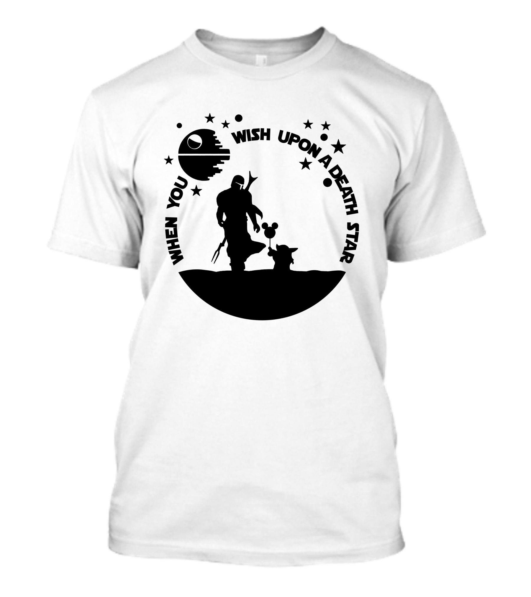 The When You Wish Upon a Death Star with Galactic Silhouettes and Stars T-shirt is designed for everyday wear and a consistent fit. Fabric is pre-shrunk ring-spun cotton with durable stitching. See the size chart below for exact measurements.