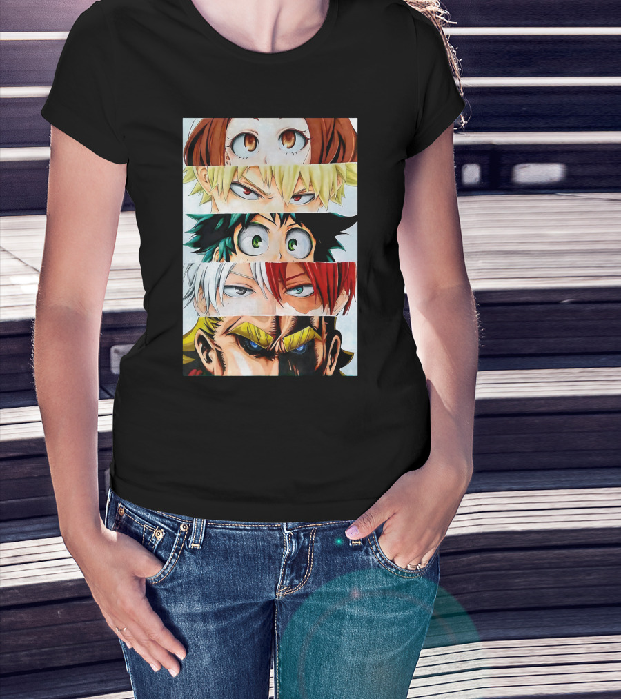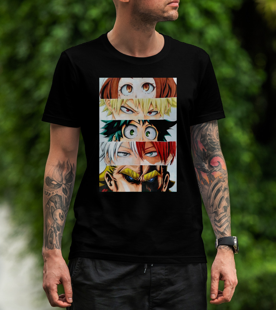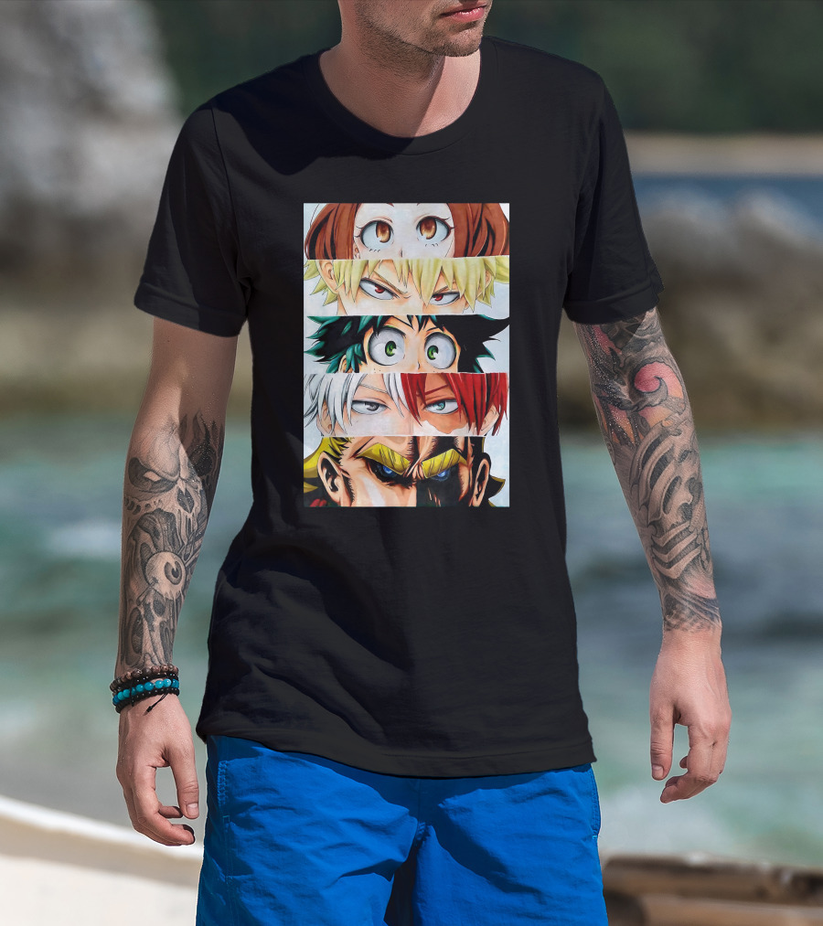 The Academia My Hero Characters Staring Eyes Todoroki Midoriya All Might T-shirt is designed for everyday wear and a consistent fit. Fabric is pre-shrunk ring-spun cotton with durable stitching. See the size chart below for exact measurements.