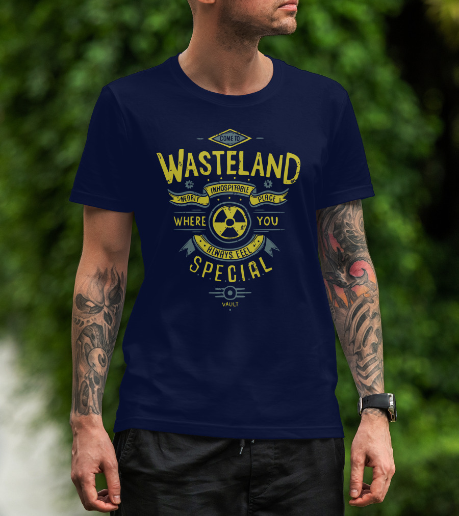 The Come to Wasteland Nearly Inhospitable Place Where You Always Feel Special Vault T-shirt is designed for everyday wear and a consistent fit. Fabric is pre-shrunk ring-spun cotton with durable stitching. See the size chart below for exact measurements.