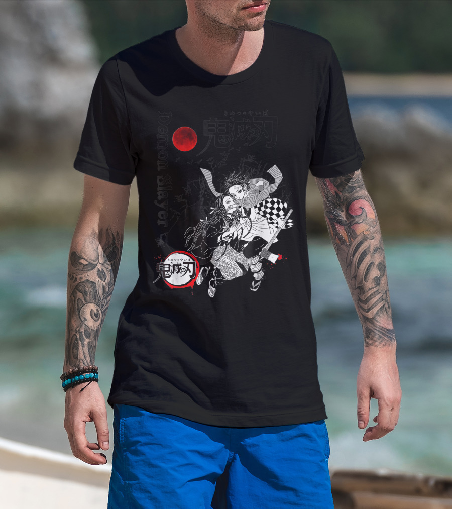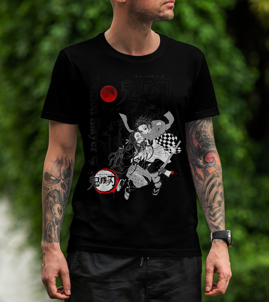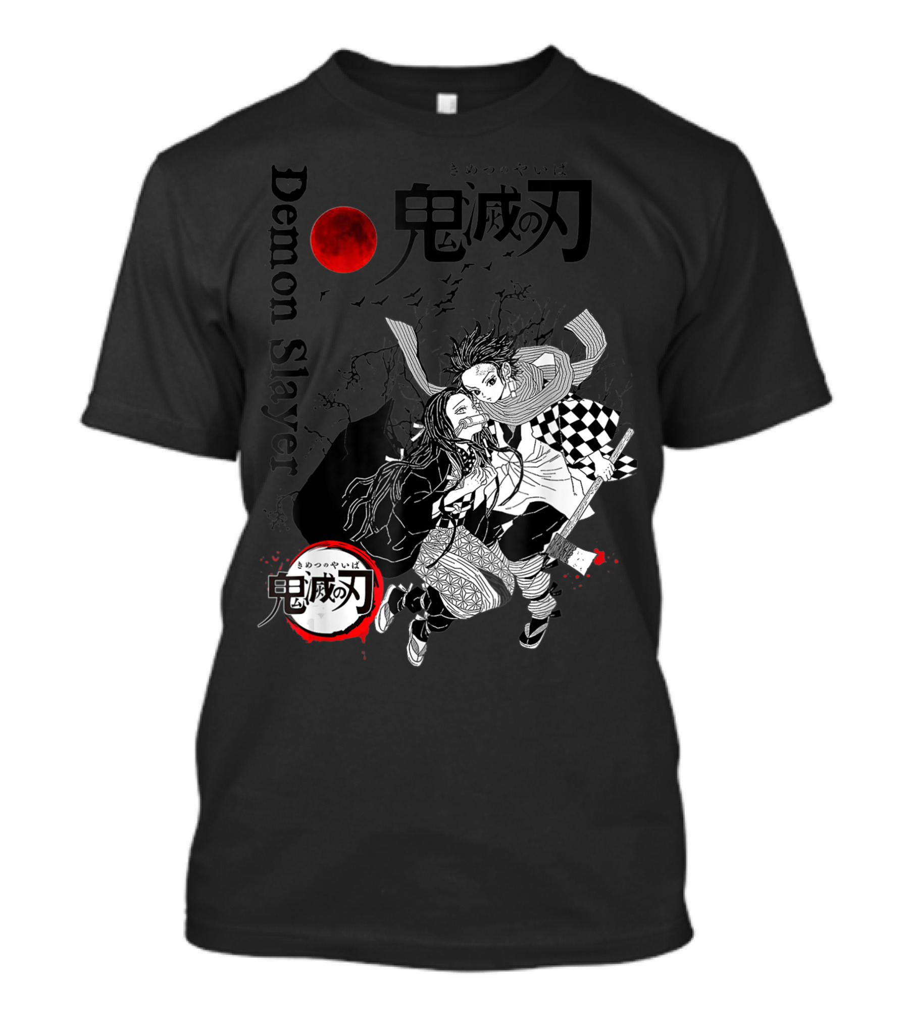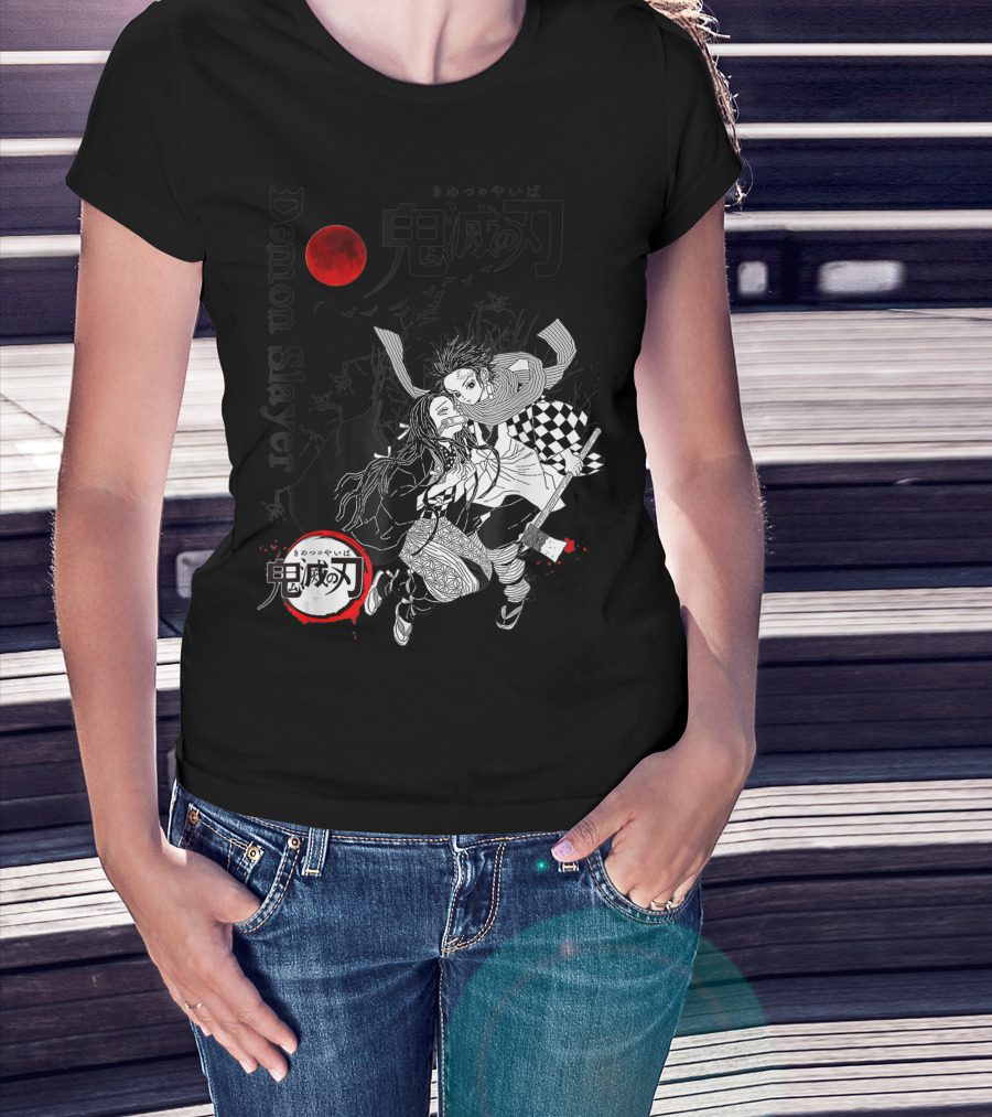 Demon Slayer Black And White Arts Anime With Red Moon T-Shirt