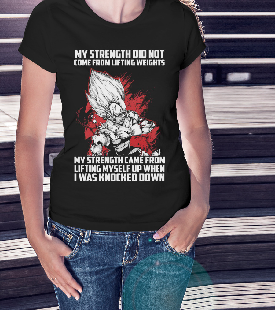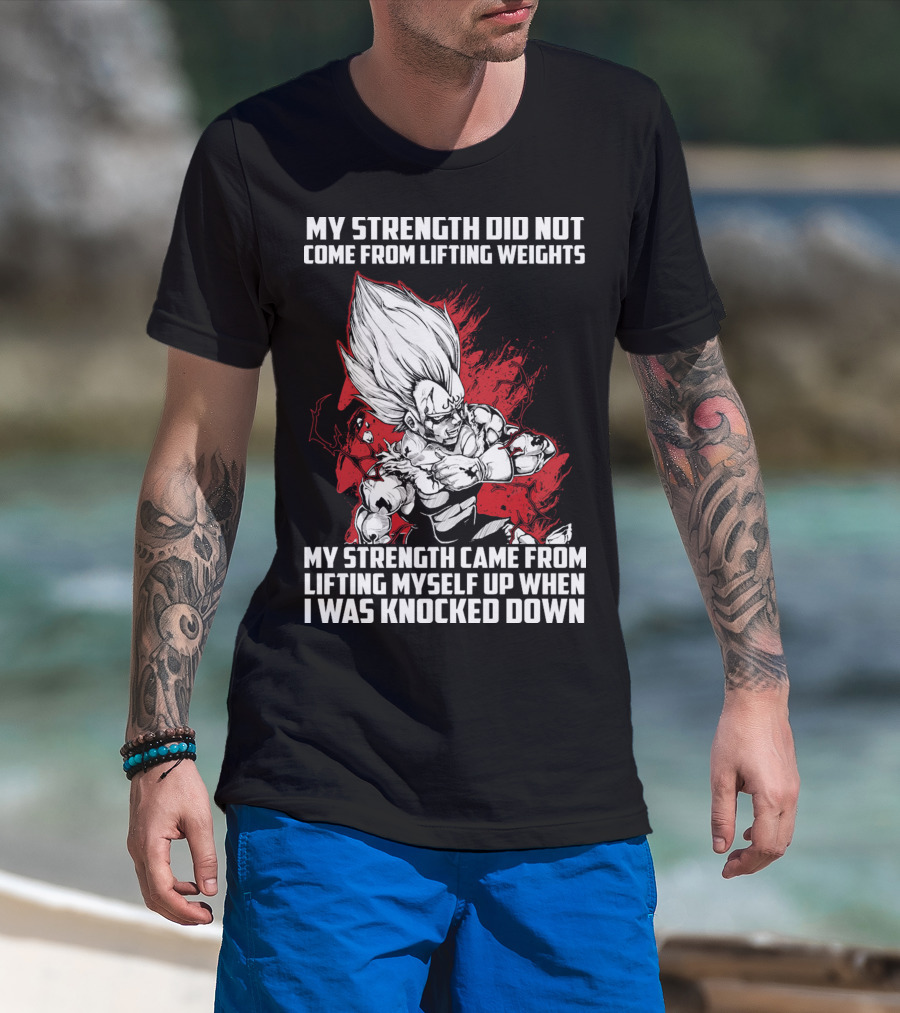 Super Saiyan Majin Vegeta My Strength Did Not Come From Lifting Weights Came From Lifting Myself Up When I Was Knocked Down T-Shirt