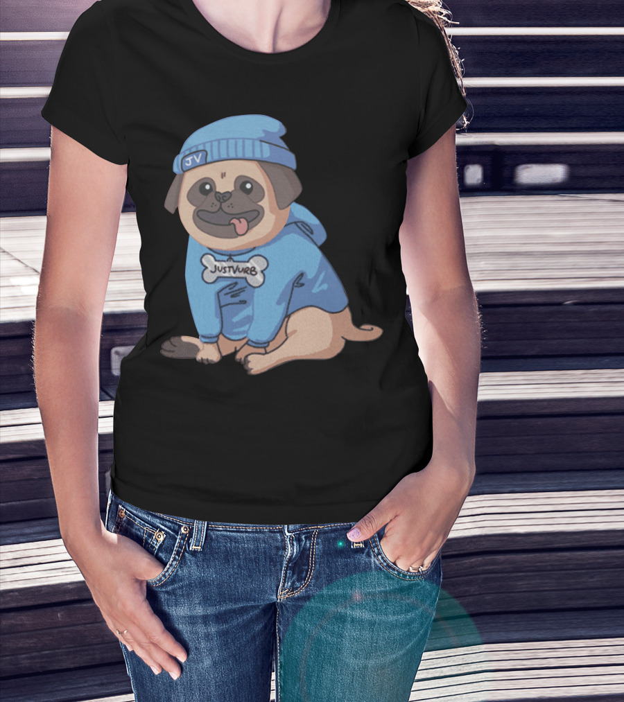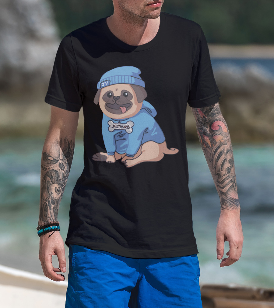 Justvurb JV Pug Dog In Blue Hoodie And Beanie T-Shirt