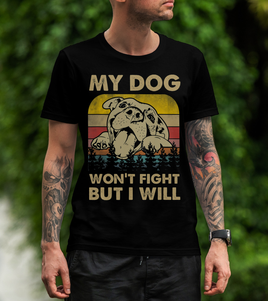 My Dog Won't Fight But I Will Vintage Pitbull Retro Sunset Forest T-Shirt