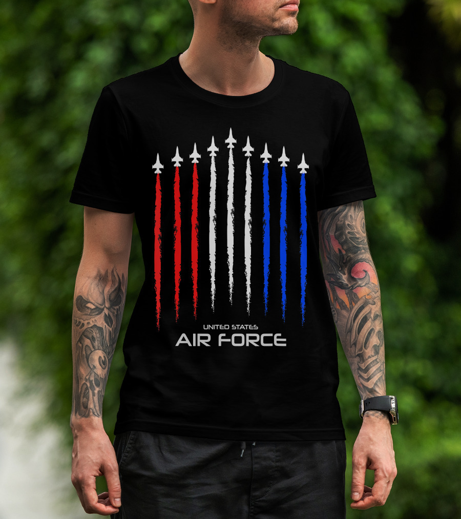 The United States Air Force American Flag Jets T-shirt is designed for everyday wear and a consistent fit. Fabric is pre-shrunk ring-spun cotton with durable stitching. See the size chart below for exact measurements.