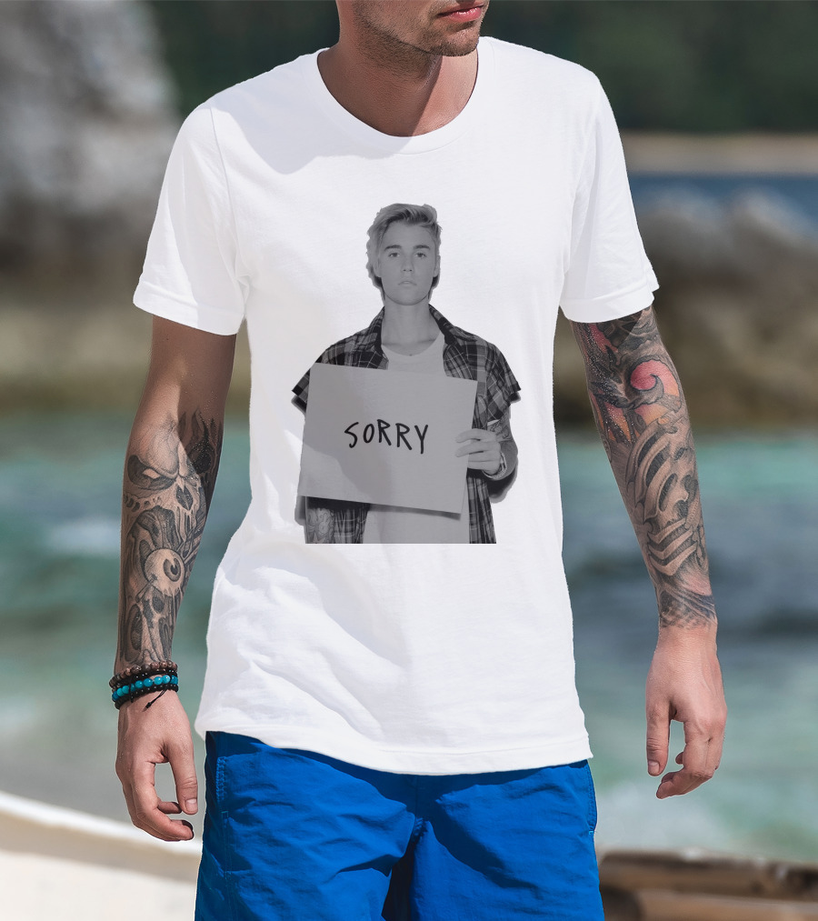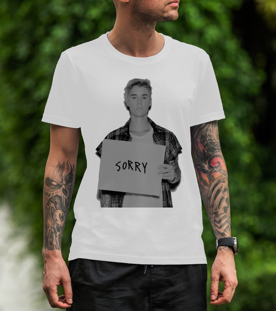 The Sorry Justin Bieber Black and White Image T-shirt is designed for everyday wear and a consistent fit. Fabric is pre-shrunk ring-spun cotton with durable stitching. See the size chart below for exact measurements.