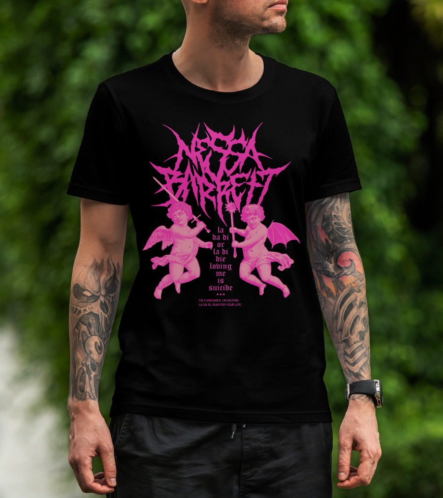 The Nessa Barrett La Da Di Or La Di Die Loving Me Is Suicide Cherubs T-shirt is designed for everyday wear and a consistent fit. Fabric is pre-shrunk ring-spun cotton with durable stitching. See the size chart below for exact measurements.