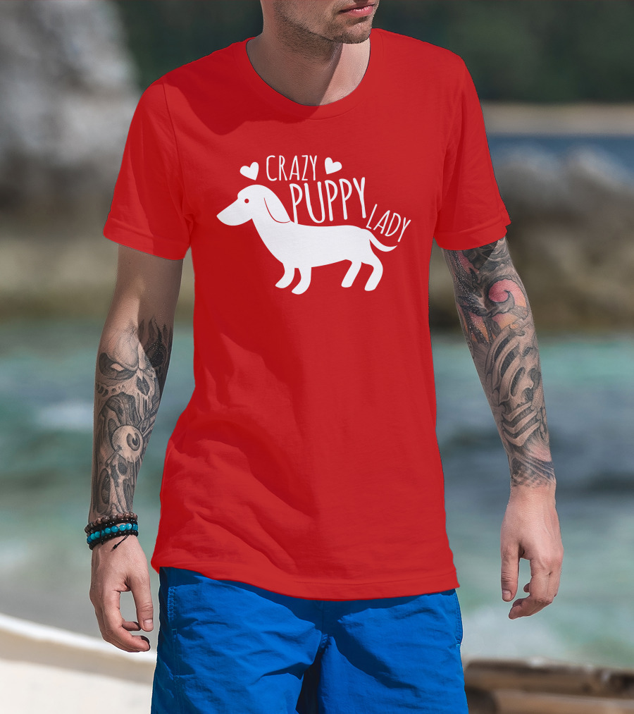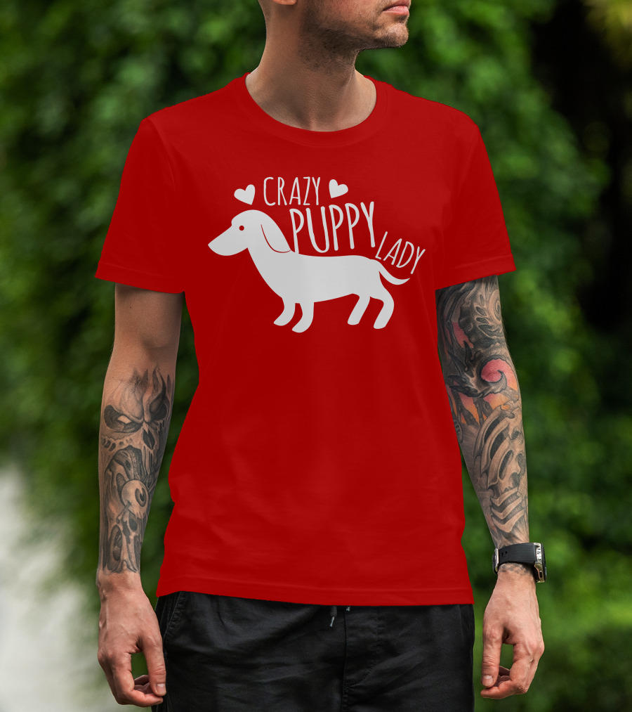 The CRAZY PUPPY LADY Dachshund Heart T-shirt is designed for everyday wear and a consistent fit. Fabric is pre-shrunk ring-spun cotton with durable stitching. See the size chart below for exact measurements.