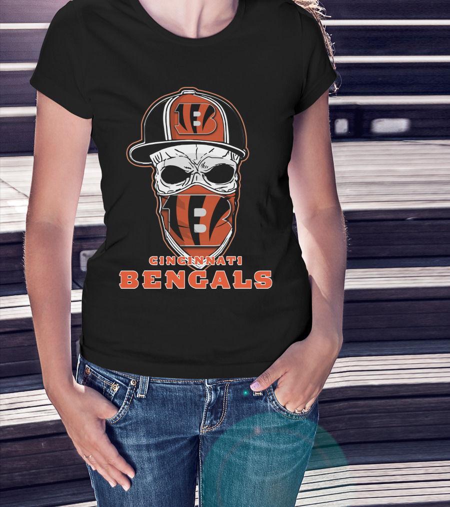 CINCINNATI BENGALS Skull Wearing Logo Hat And Bandana T-Shirt