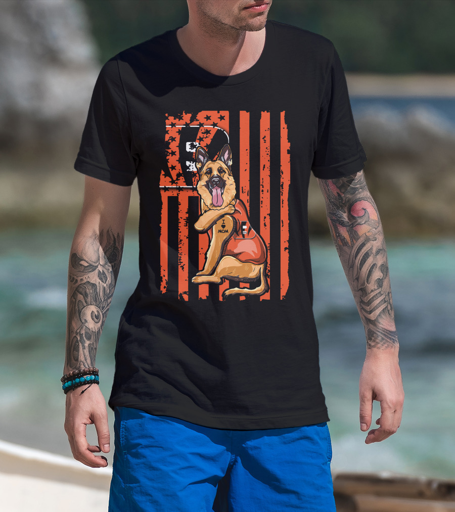 The German Shepherd I Love Mom Cincinnati Bengals American Flag T-shirt is designed for everyday wear and a consistent fit. Fabric is pre-shrunk ring-spun cotton with durable stitching. See the size chart below for exact measurements.