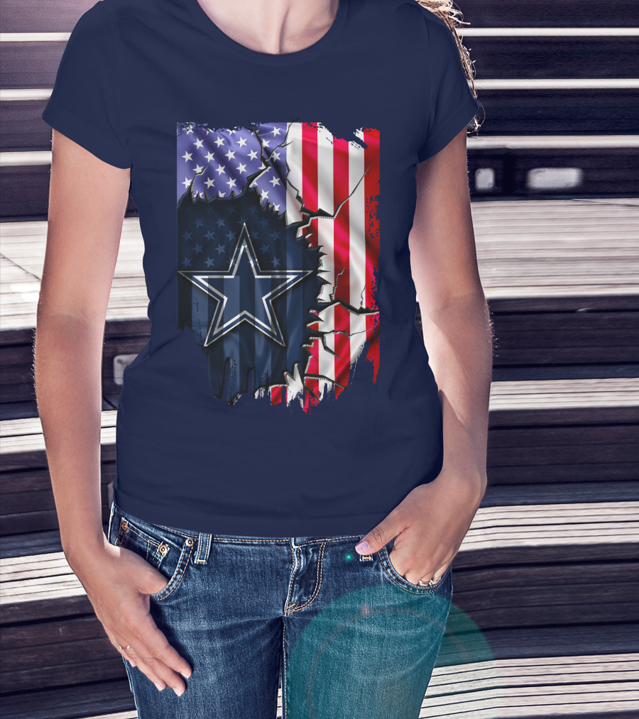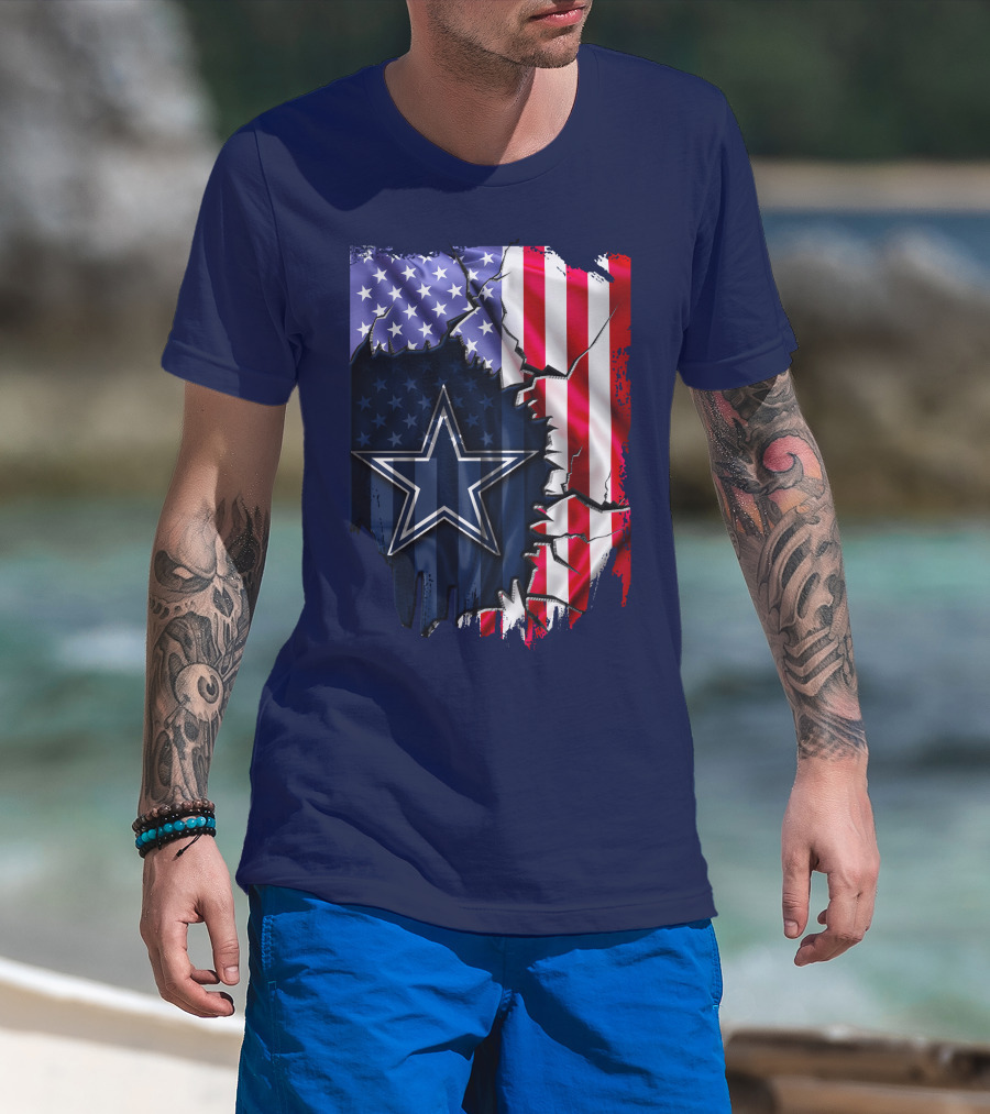 The American Flag Dallas Cowboys Star T-shirt is designed for everyday wear and a consistent fit. Fabric is pre-shrunk ring-spun cotton with durable stitching. See the size chart below for exact measurements.