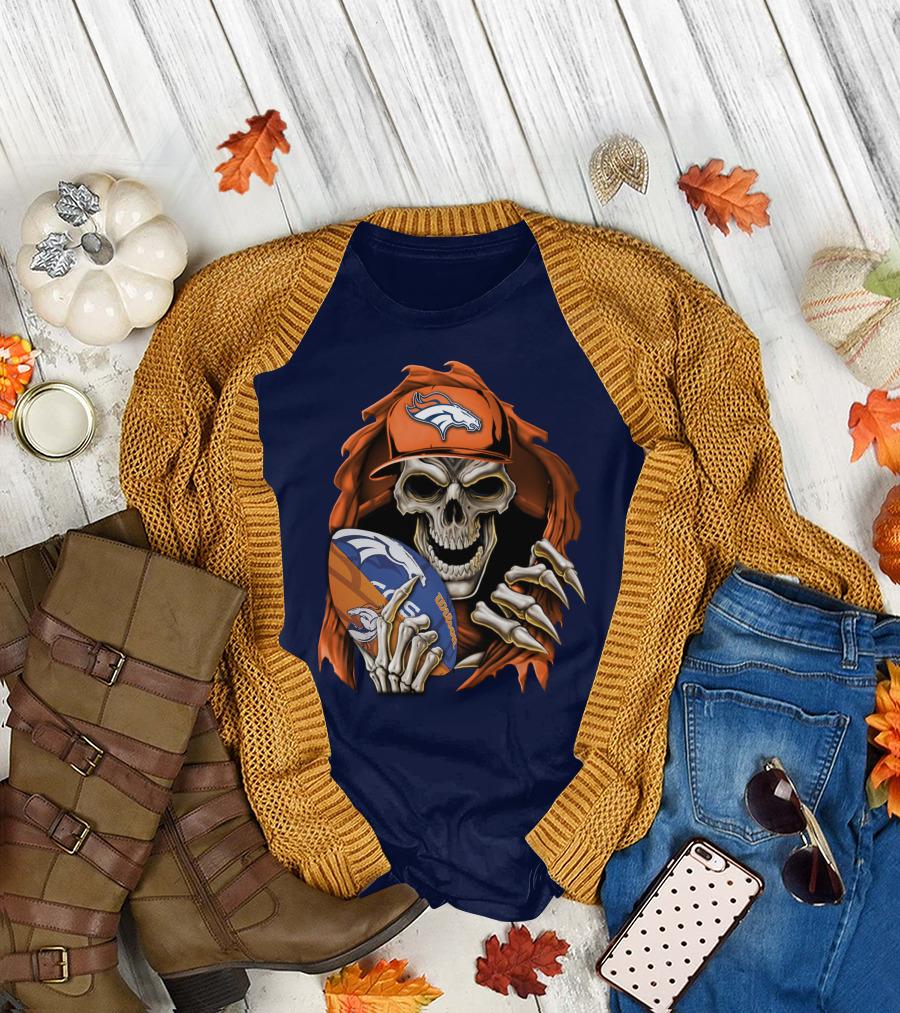 Skullbong Denver Broncos Skeleton Holding Football With Team Logo Helmet And Cap T-Shirt