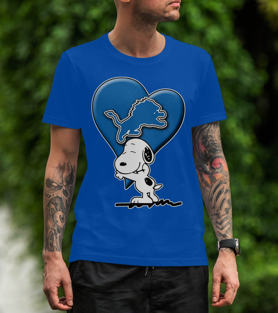 Snp DETROIT LIONS Blue Heart Snoopy Hugging Lion T-Shirt