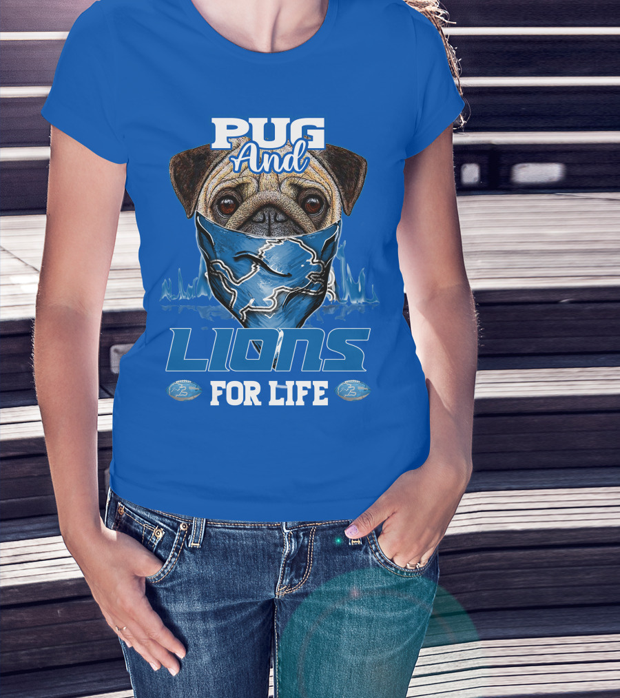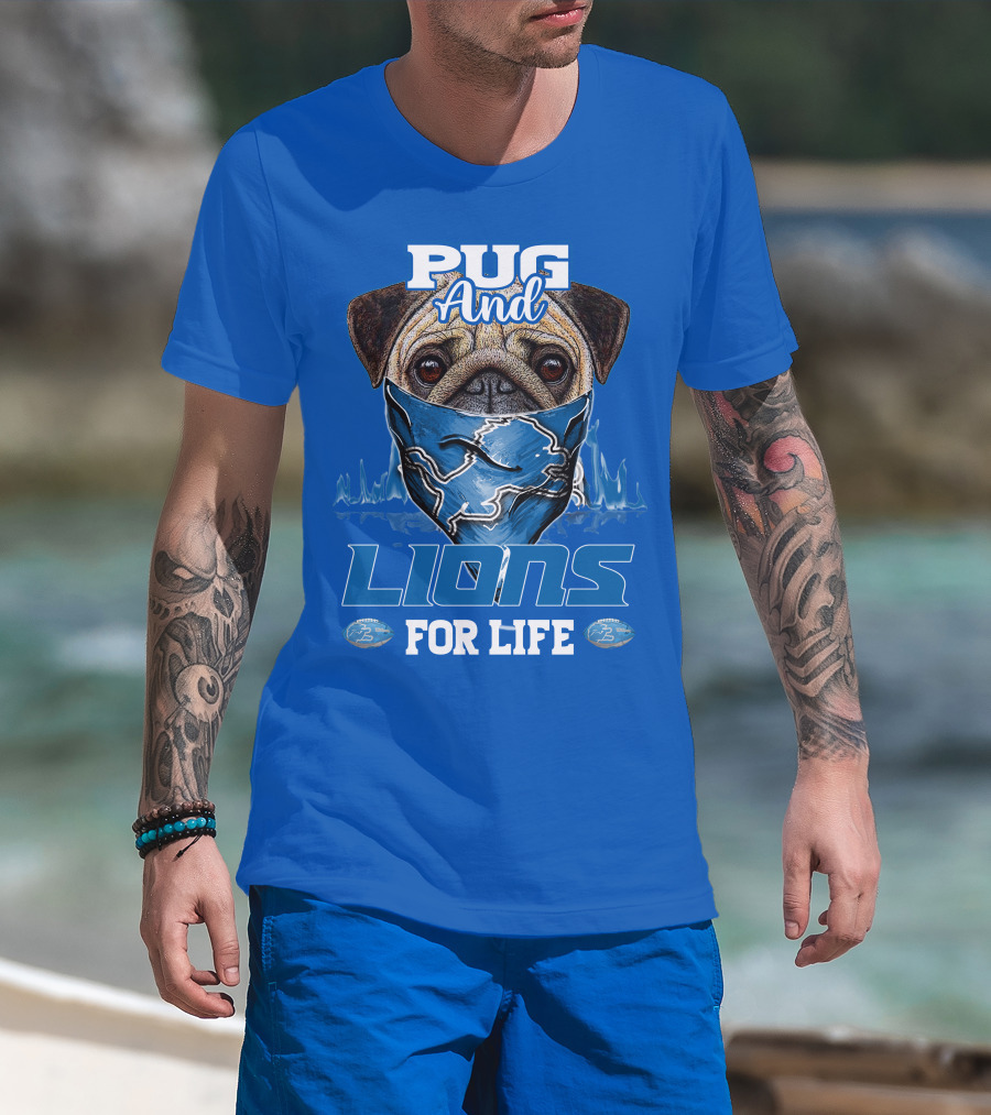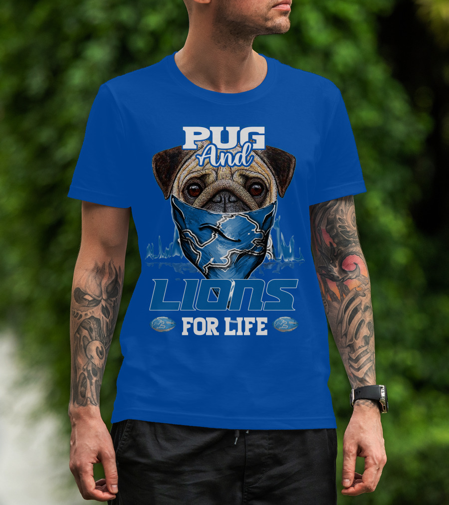 The Pug and Detroit Lions for Life T-shirt is designed for everyday wear and a consistent fit. Fabric is pre-shrunk ring-spun cotton with durable stitching. See the size chart below for exact measurements.