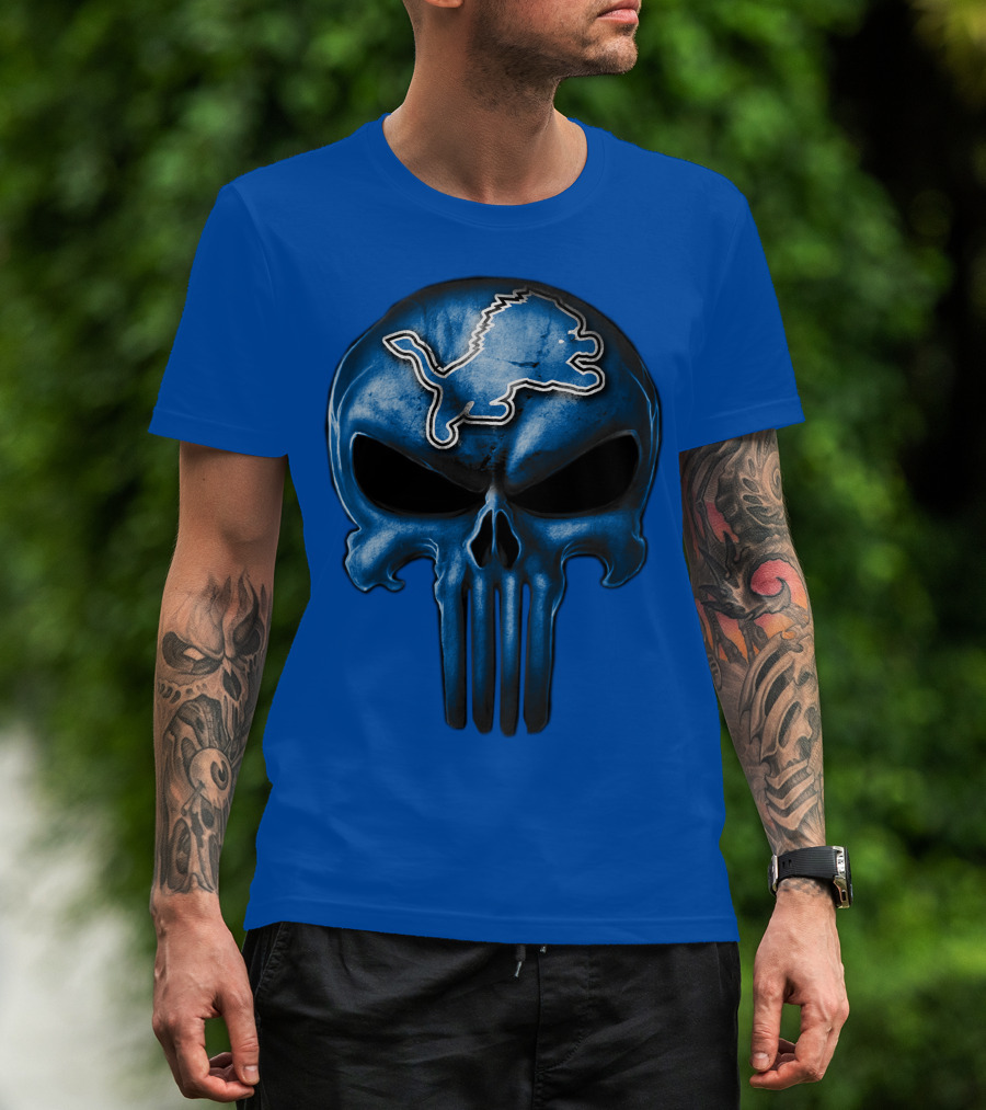 The Detroit Lions Skull Logo Punisher T-shirt is designed for everyday wear and a consistent fit. Fabric is pre-shrunk ring-spun cotton with durable stitching. See the size chart below for exact measurements.