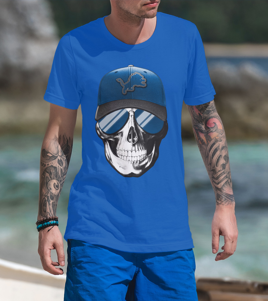 Skull Wearing Detroit Lions Cap With Reflective Sunglasses T-Shirt