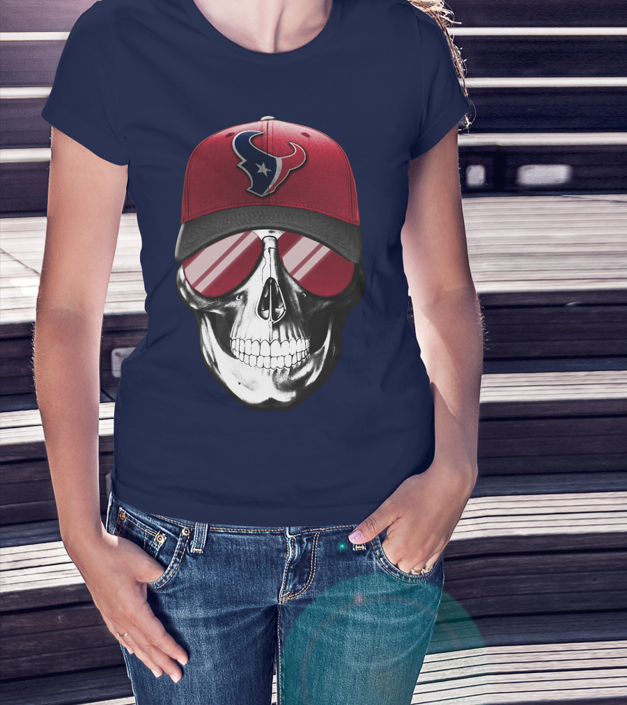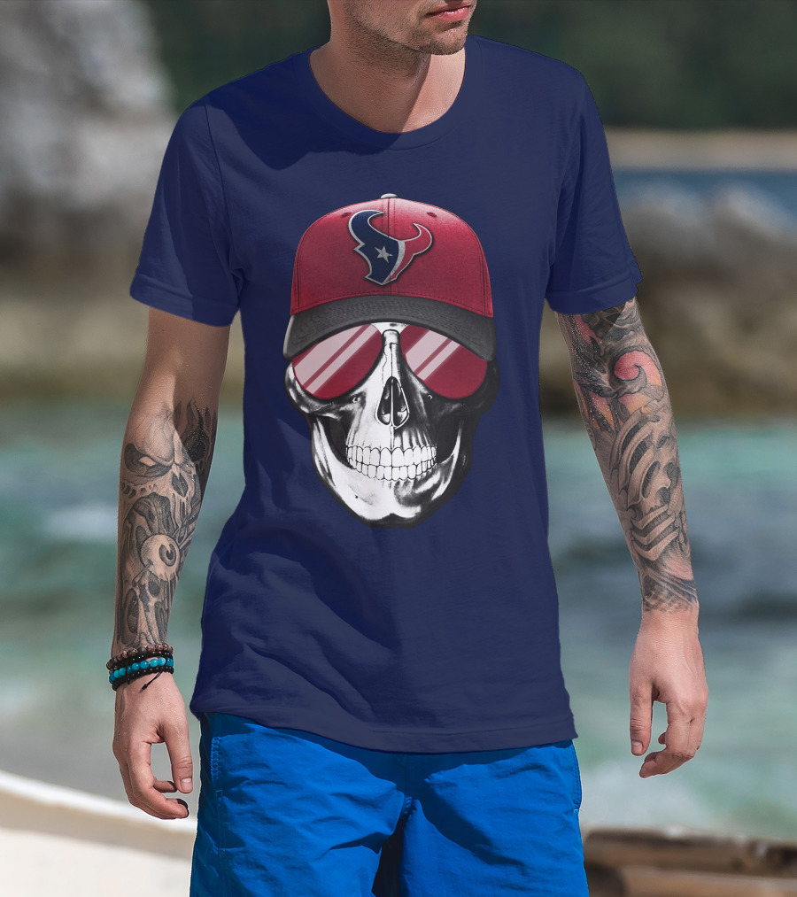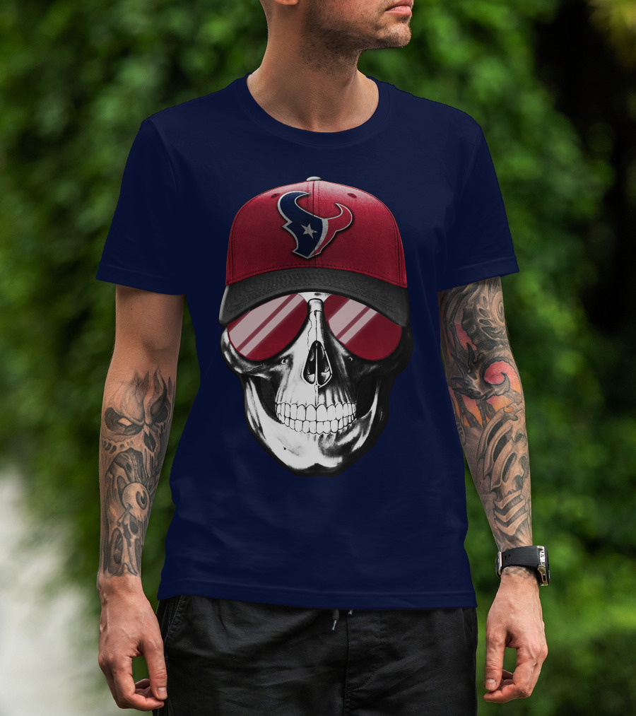 Skull With Houston Texans Logo Hat And Reflective Sunglasses T-Shirt