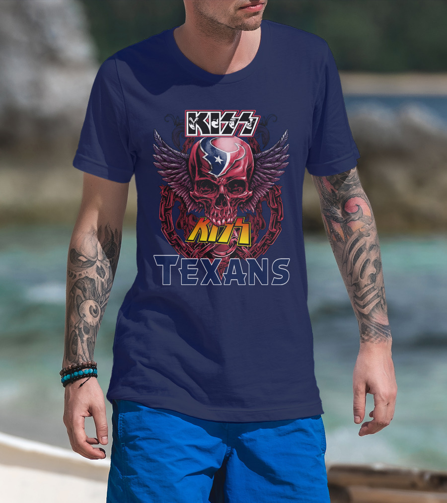 The KISS Houston Texans Skull Wings T-shirt is designed for everyday wear and a consistent fit. Fabric is pre-shrunk ring-spun cotton with durable stitching. See the size chart below for exact measurements.