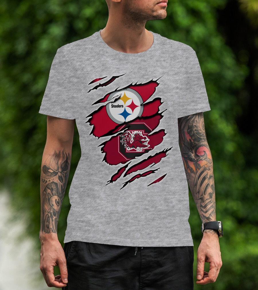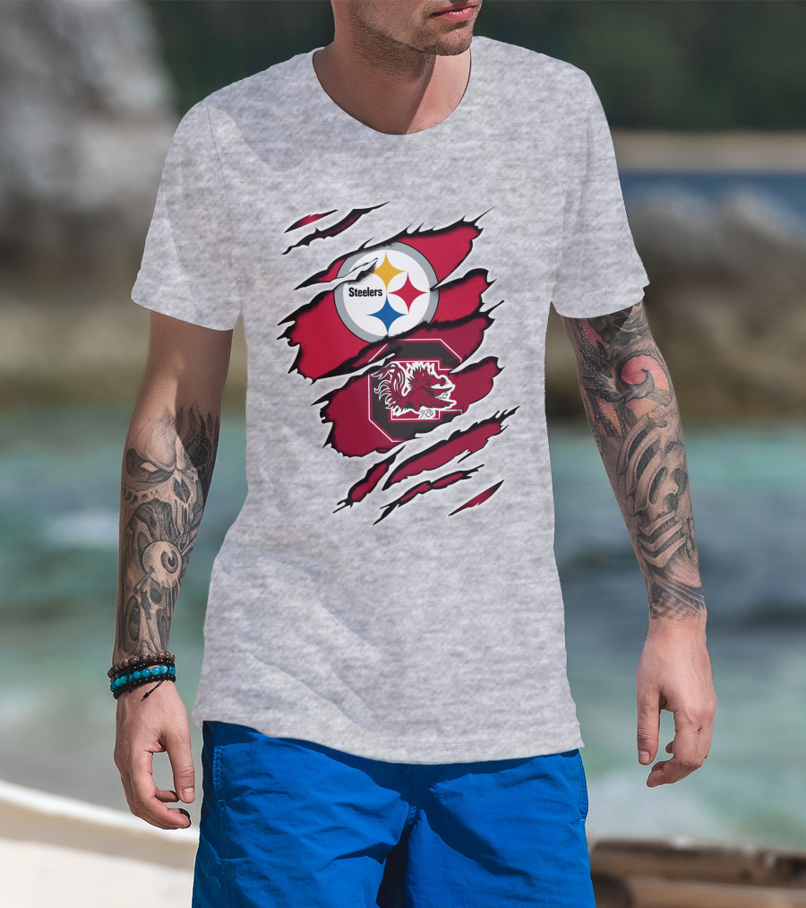 The Steelers Gamecocks Ripped T-shirt is designed for everyday wear and a consistent fit. Fabric is pre-shrunk ring-spun cotton with durable stitching. See the size chart below for exact measurements.