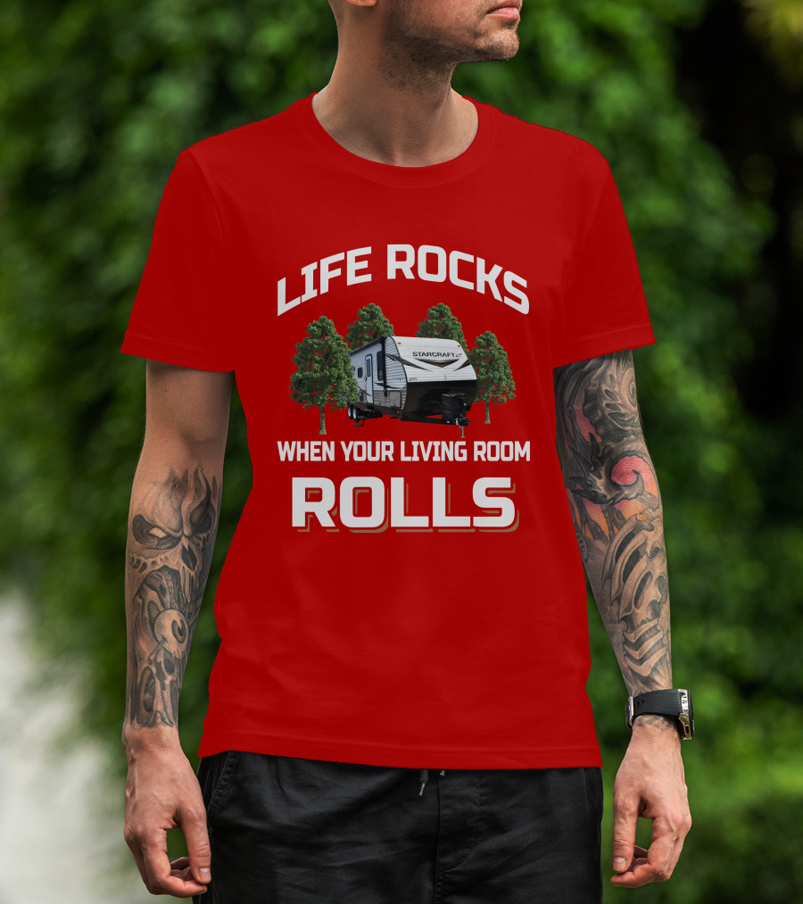 The LIFE ROCKS WHEN YOUR LIVING ROOM ROLLS AUTUMN RIDGE 27BHS STARCRAFT T-shirt is designed for everyday wear and a consistent fit. Fabric is pre-shrunk ring-spun cotton with durable stitching. See the size chart below for exact measurements.