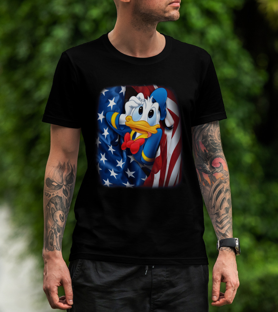 The Donald Fourth of July American Flag T-shirt is designed for everyday wear and a consistent fit. Fabric is pre-shrunk ring-spun cotton with durable stitching. See the size chart below for exact measurements.