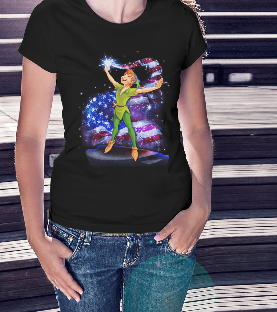 The Peter Pan Bling USA Flag July T-shirt is designed for everyday wear and a consistent fit. Fabric is pre-shrunk ring-spun cotton with durable stitching. See the size chart below for exact measurements.