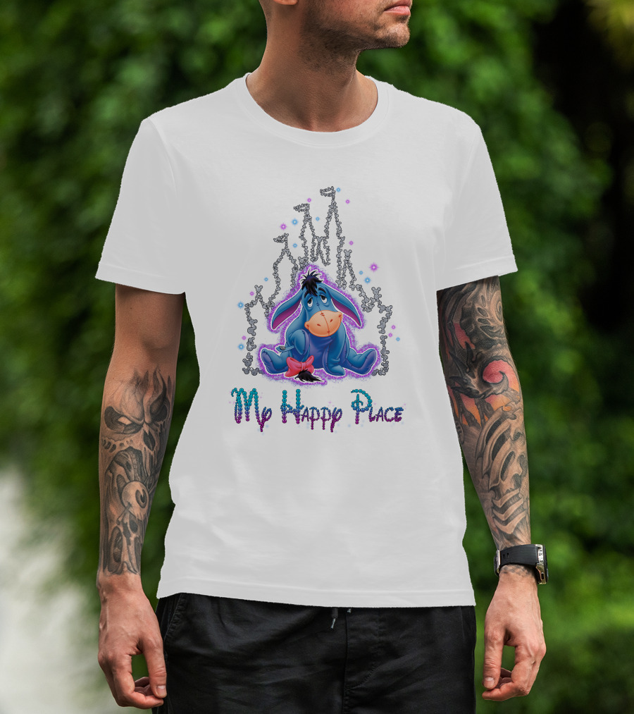 The Eeyore My Happy Place Disney Castle T-shirt is designed for everyday wear and a consistent fit. Fabric is pre-shrunk ring-spun cotton with durable stitching. See the size chart below for exact measurements.