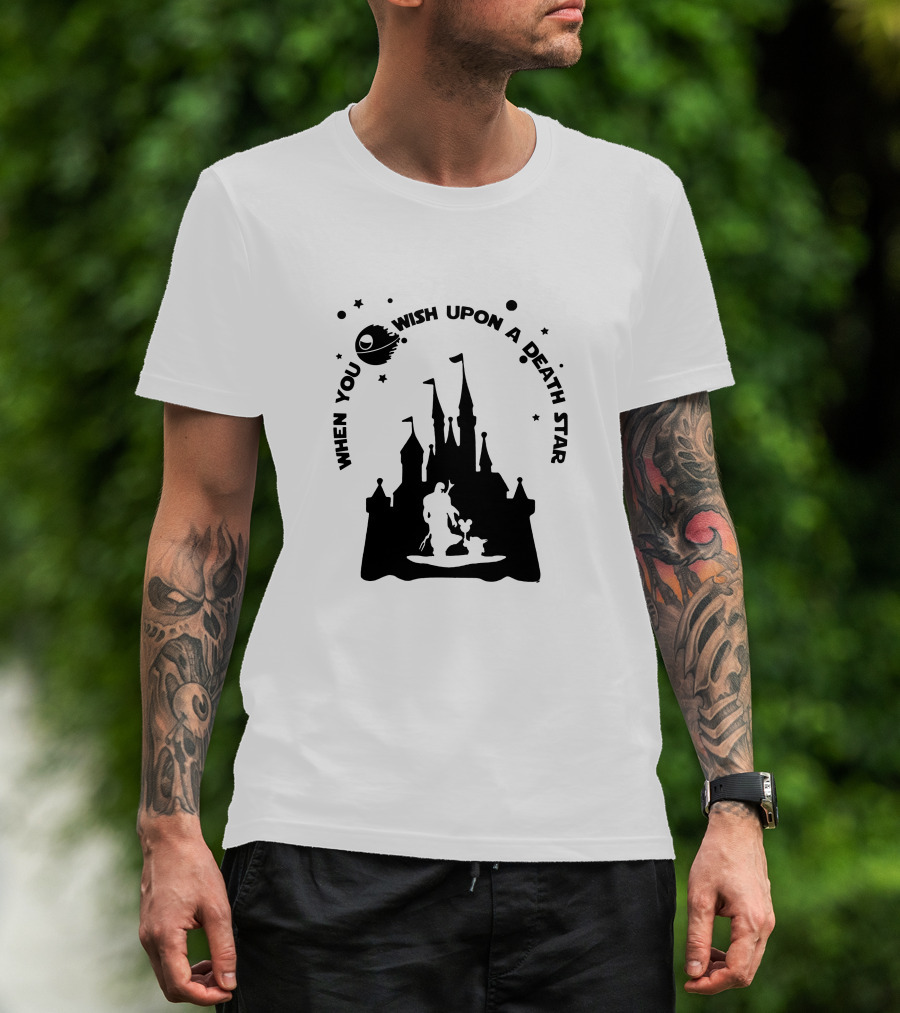 The When You Wish Upon a Death Star Disney Castle Baby Yoda T-shirt is designed for everyday wear and a consistent fit. Fabric is pre-shrunk ring-spun cotton with durable stitching. See the size chart below for exact measurements.