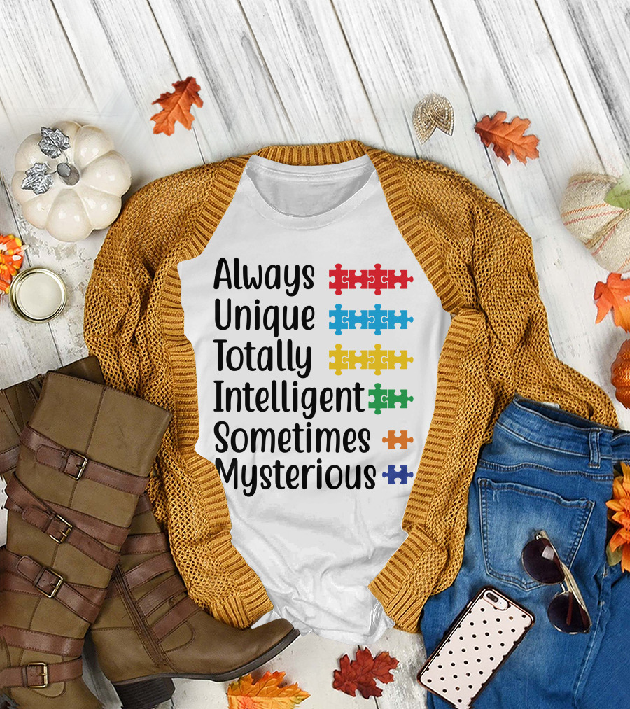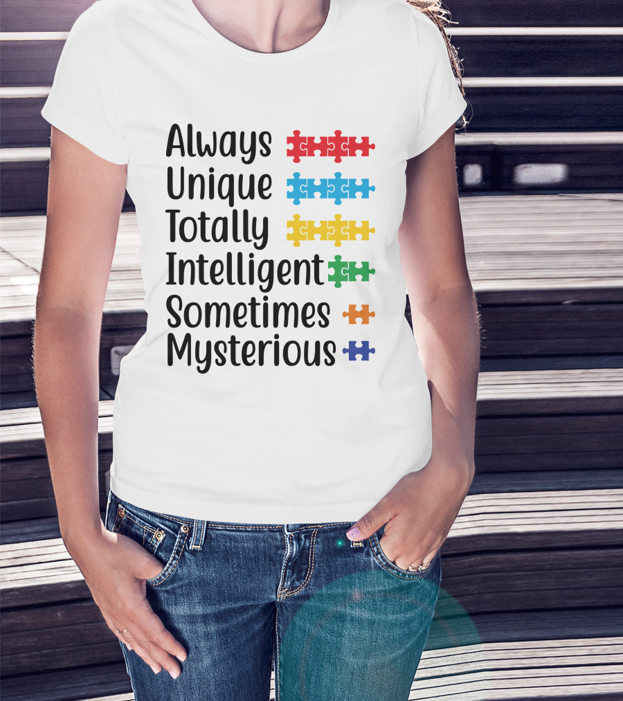 The Always Unique Totally Intelligent Sometimes Mysterious Puzzle Pieces T-shirt is designed for everyday wear and a consistent fit. Fabric is pre-shrunk ring-spun cotton with durable stitching. See the size chart below for exact measurements.
