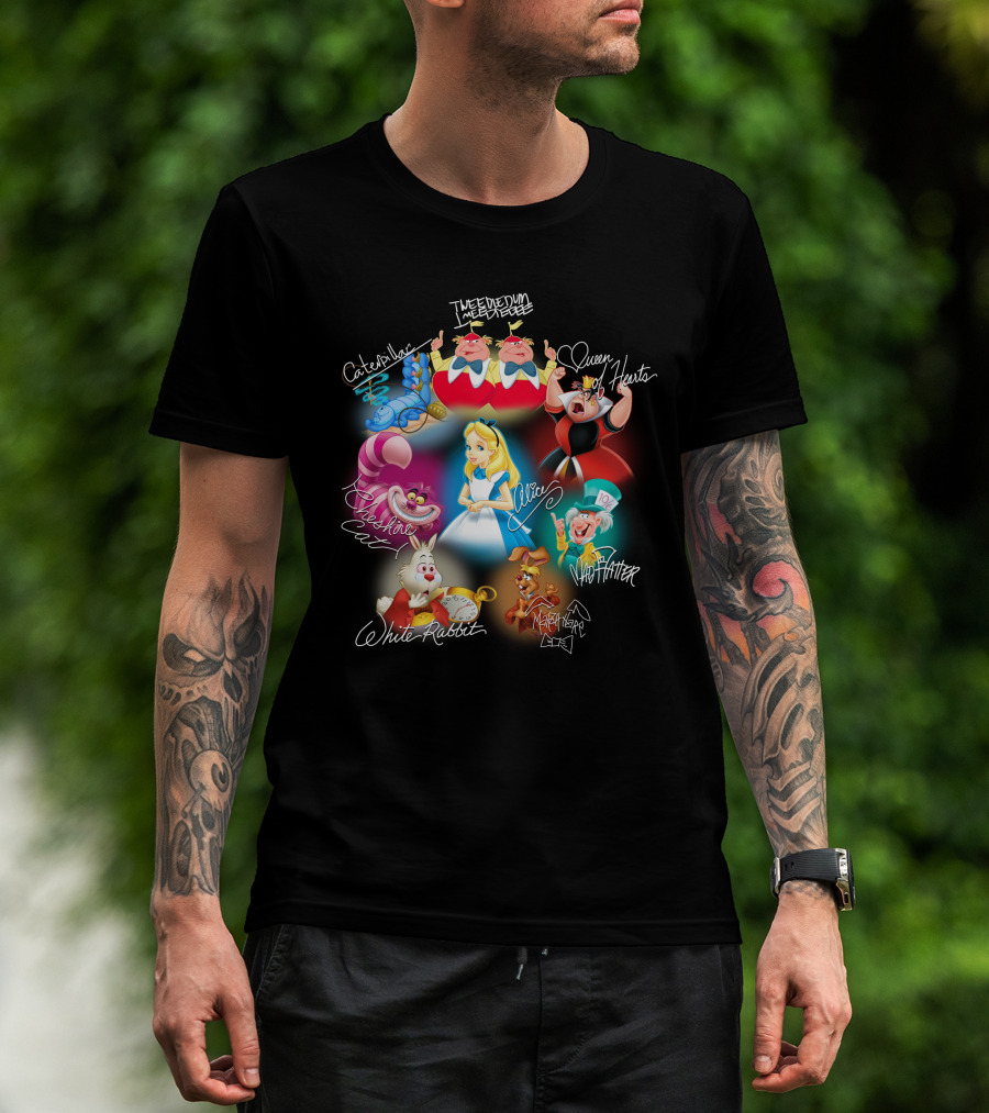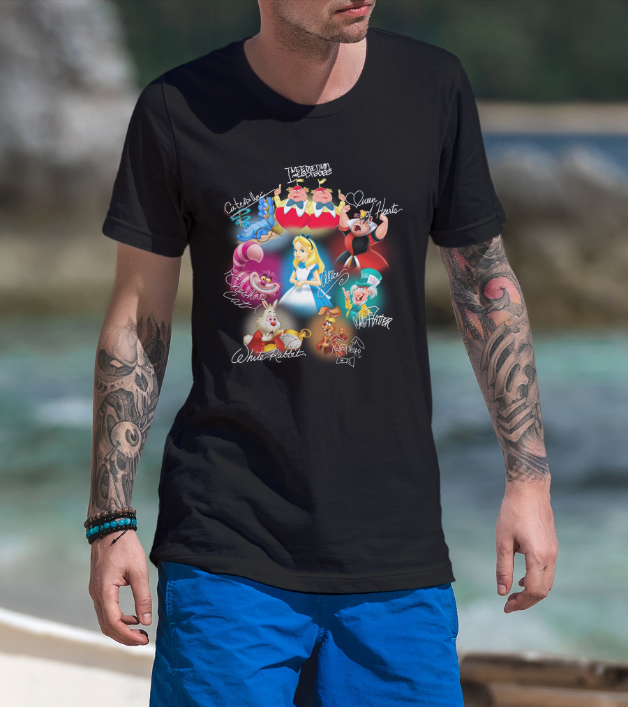 Alice Tweedledee Tweedledum Queen Hearts Cheshire Cat White Rabbit Mad Hatter Caterpillar March Hare Signatures T-Shirt
