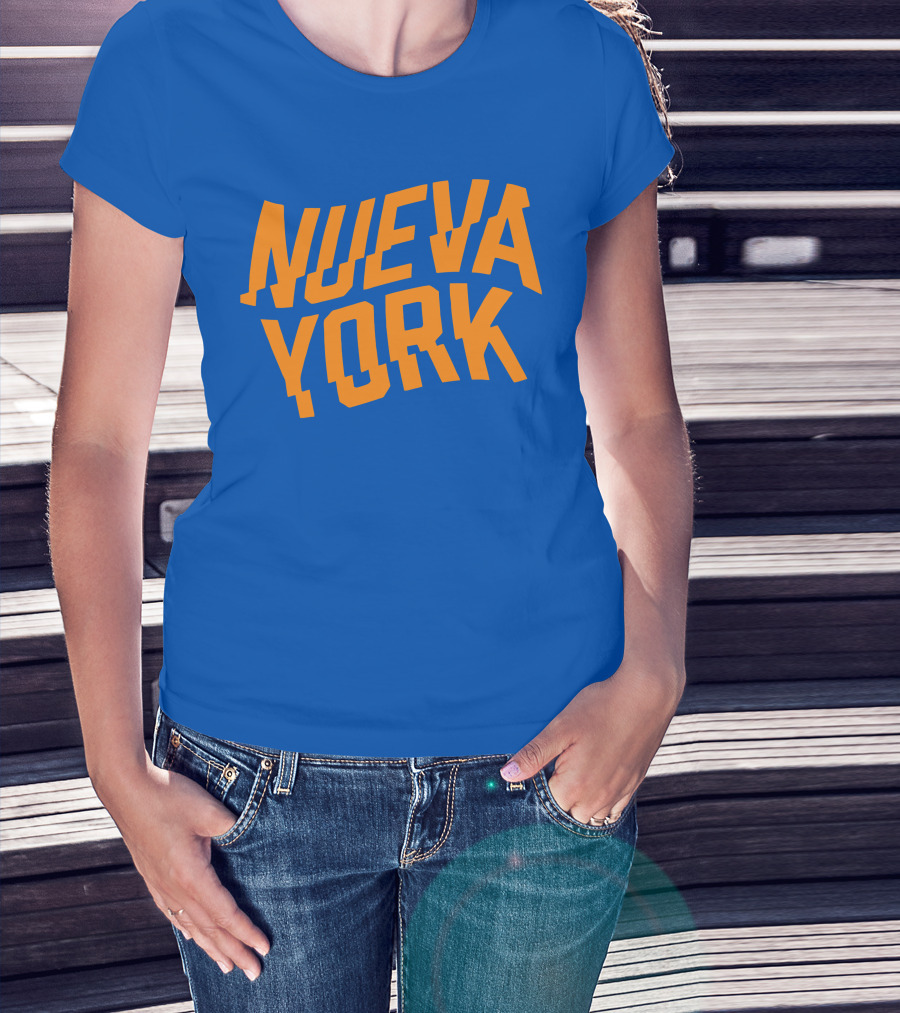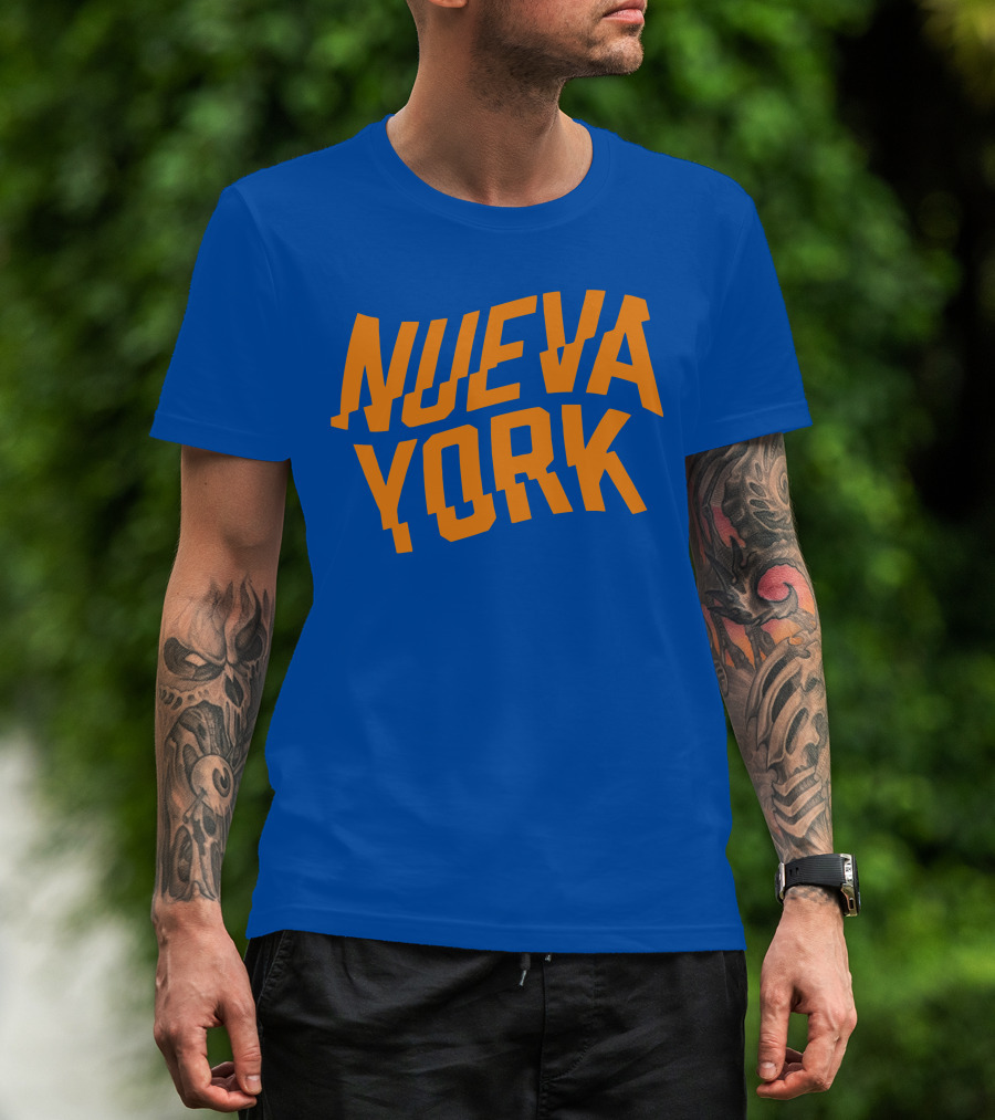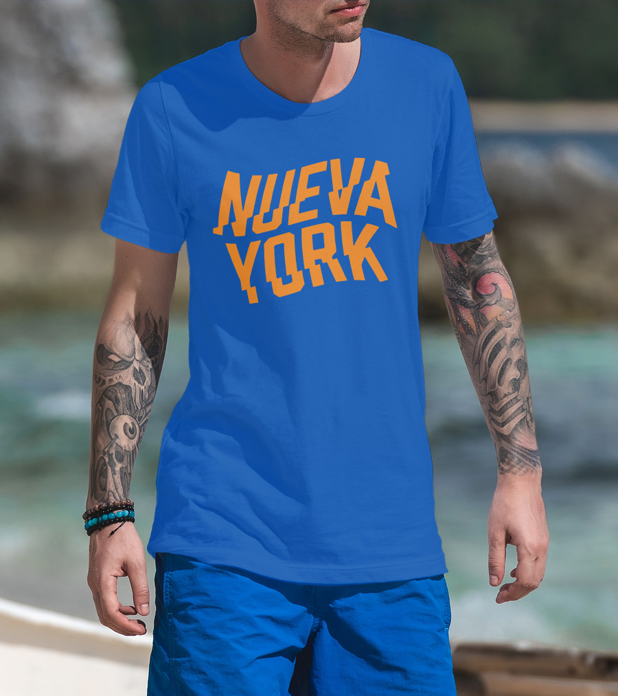 The Nueva York Bold Orange Blue T-shirt is designed for everyday wear and a consistent fit. Fabric is pre-shrunk ring-spun cotton with durable stitching. See the size chart below for exact measurements.