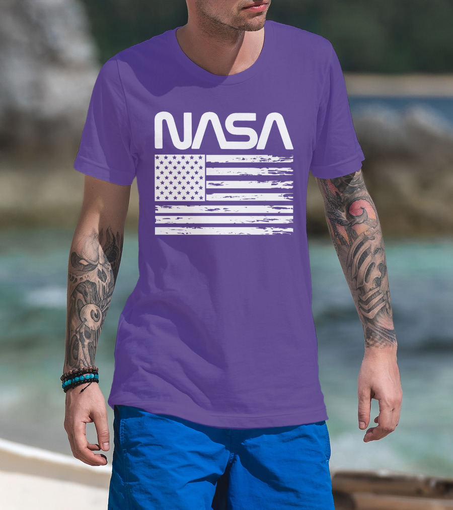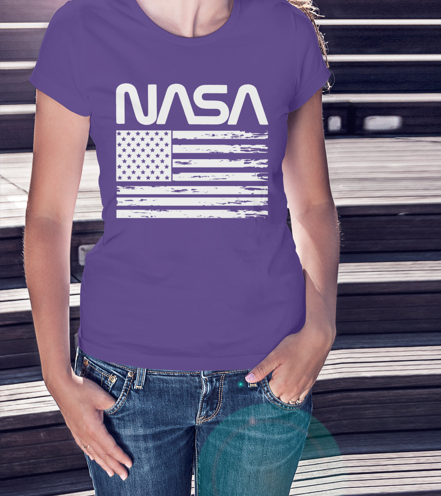 The NASA Distressed American Flag Rocketry T-shirt is designed for everyday wear and a consistent fit. Fabric is pre-shrunk ring-spun cotton with durable stitching. See the size chart below for exact measurements.