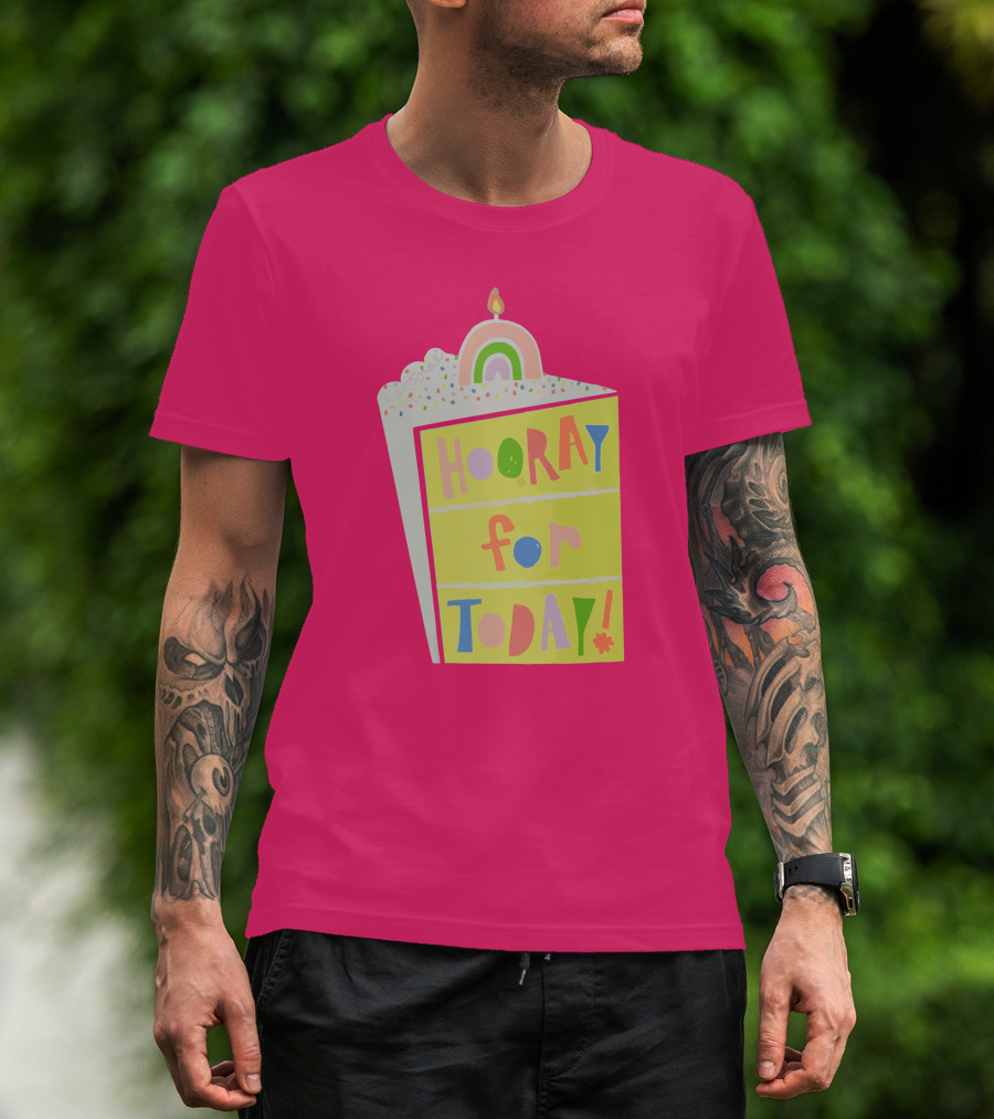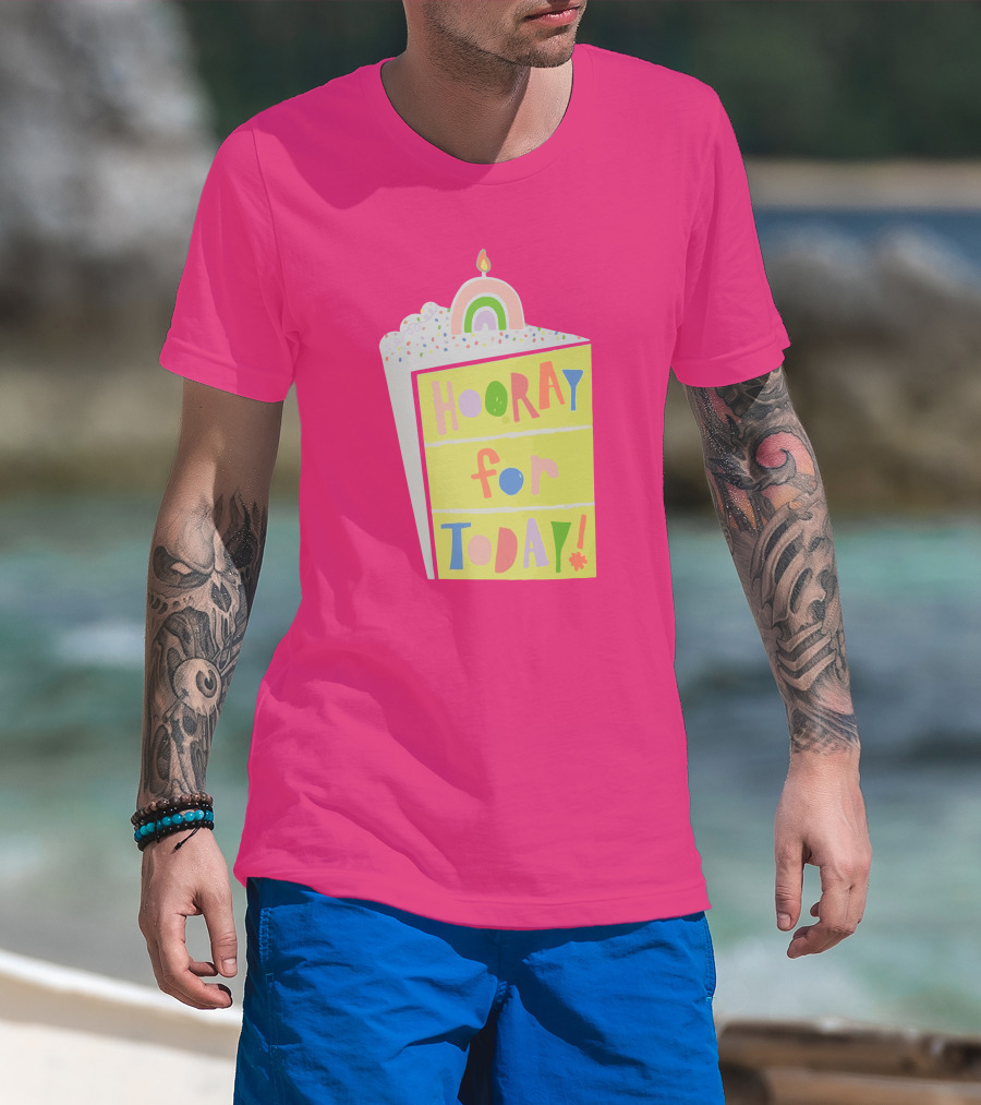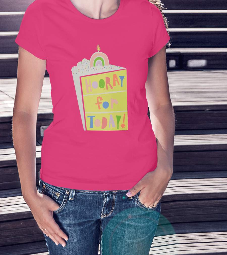 The Hooray for Today Rainbow Cake T-shirt is designed for everyday wear and a consistent fit. Fabric is pre-shrunk ring-spun cotton with durable stitching. See the size chart below for exact measurements.