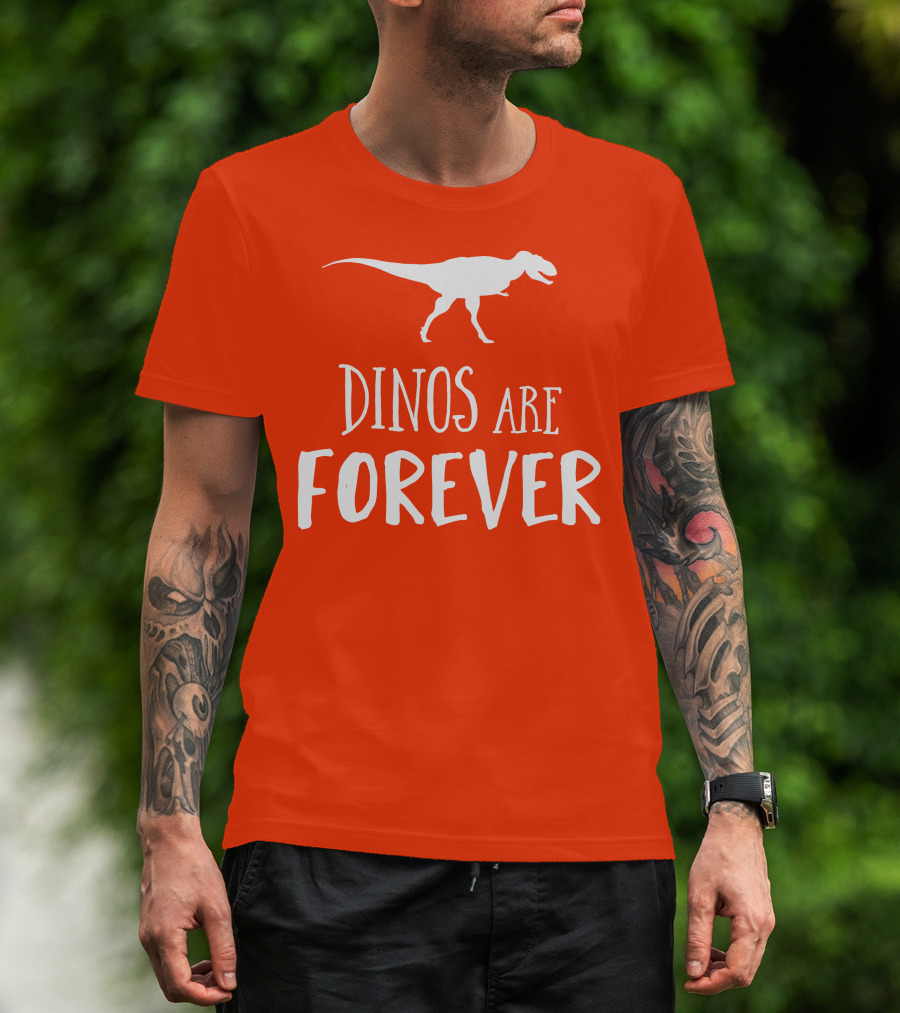 The Dinos Are Forever T-Rex T-shirt is designed for everyday wear and a consistent fit. Fabric is pre-shrunk ring-spun cotton with durable stitching. See the size chart below for exact measurements.