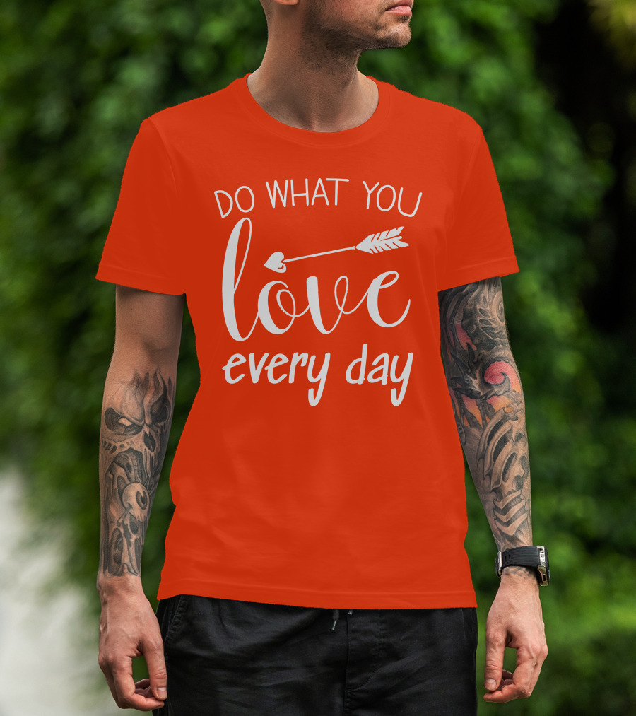 The Do What You Love Every Day Arrow Motif T-shirt is designed for everyday wear and a consistent fit. Fabric is pre-shrunk ring-spun cotton with durable stitching. See the size chart below for exact measurements.
