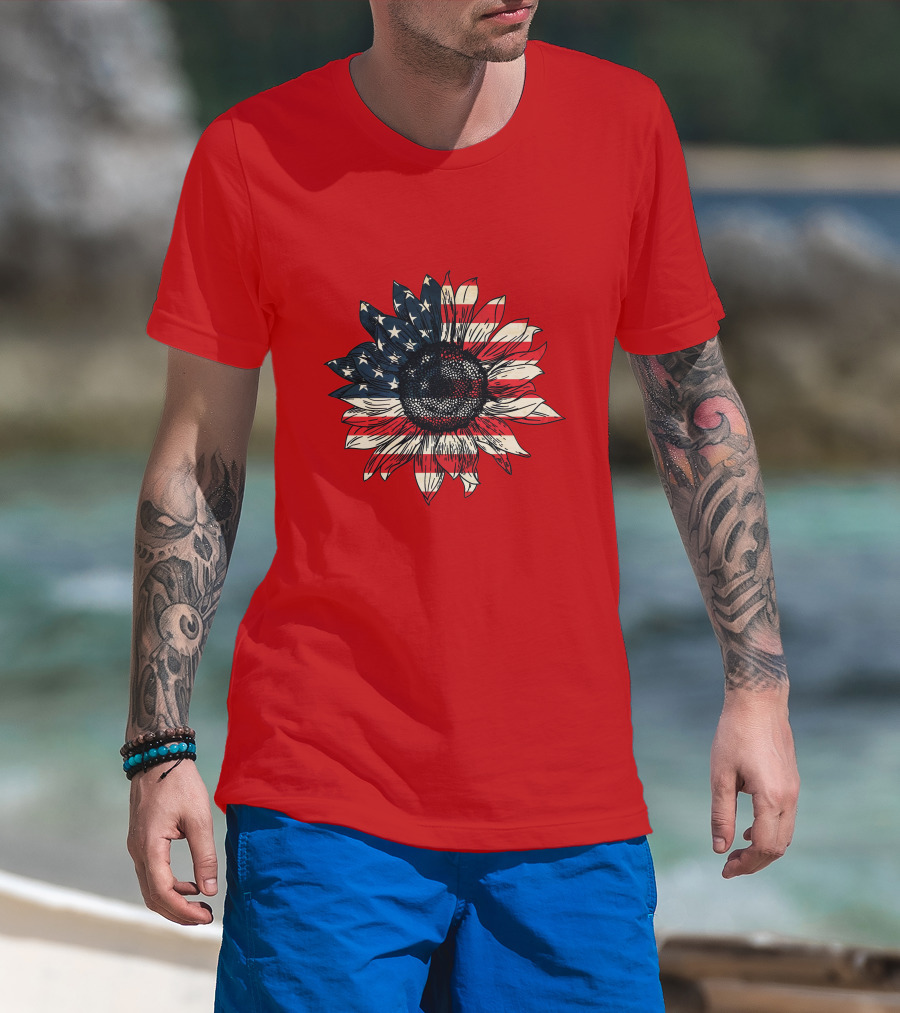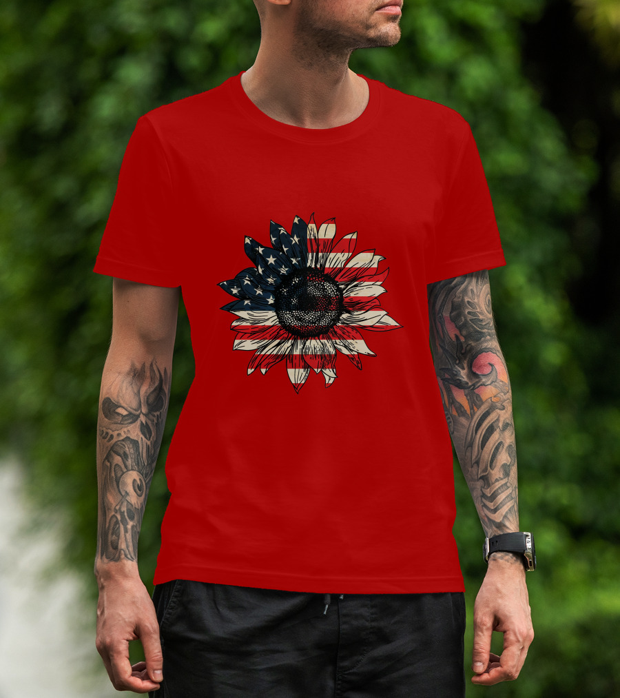 The Sunflower American Flag USA Independence Day Flower T-shirt is designed for everyday wear and a consistent fit. Fabric is pre-shrunk ring-spun cotton with durable stitching. See the size chart below for exact measurements.