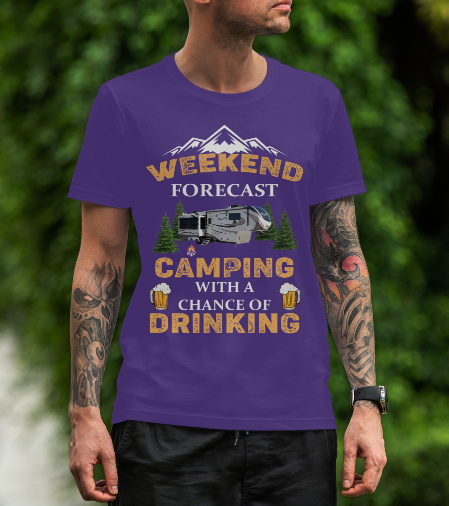 The Weekend Forecast Camping With a Chance of Drinking Mountain RV T-shirt is designed for everyday wear and a consistent fit. Fabric is pre-shrunk ring-spun cotton with durable stitching. See the size chart below for exact measurements.