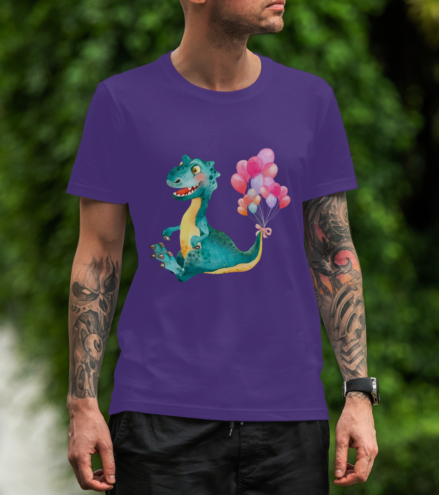 The Dinosaur with Colorful Balloons T-shirt is designed for everyday wear and a consistent fit. Fabric is pre-shrunk ring-spun cotton with durable stitching. See the size chart below for exact measurements.