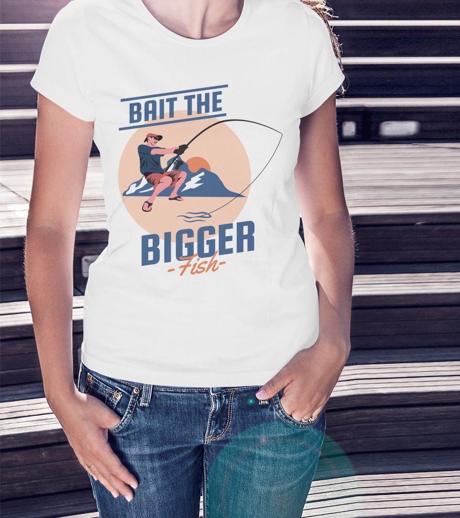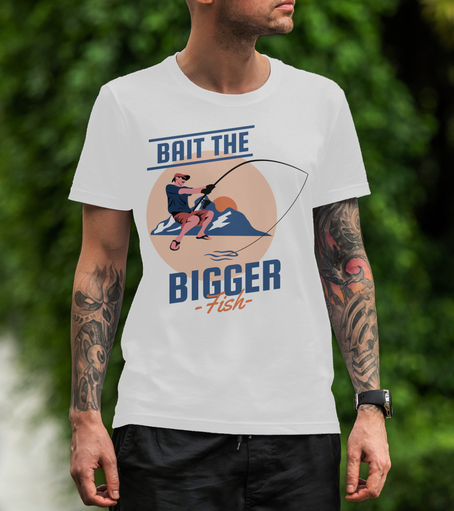 Bait The Bigger Fish Angler Adventure With Fishing Rod And Mountain Sunset T-Shirt