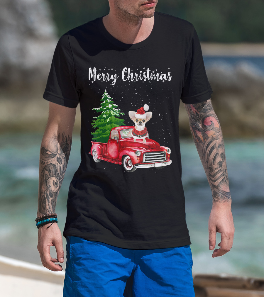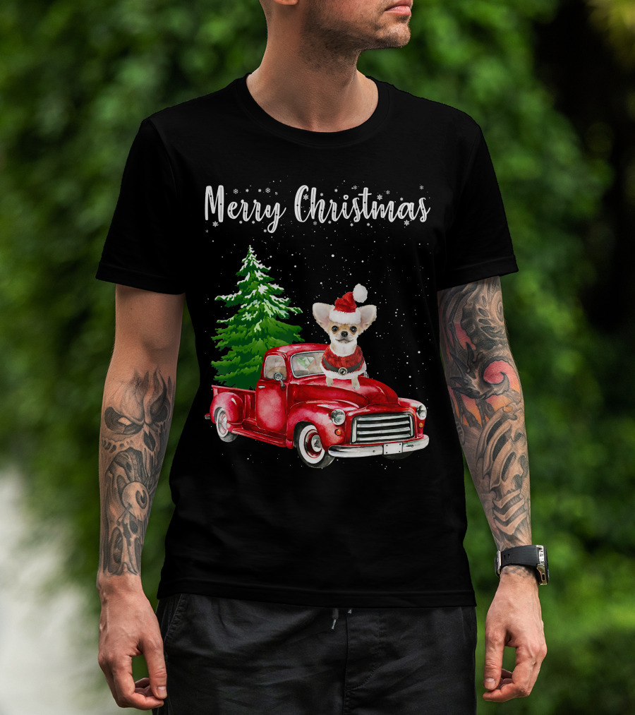 Merry Christmas Chihuahua With Santa Hat Riding Red Truck And Christmas Tree T-Shirt