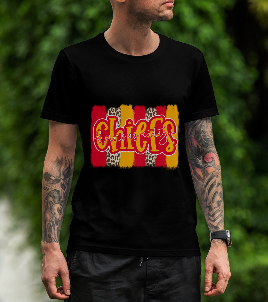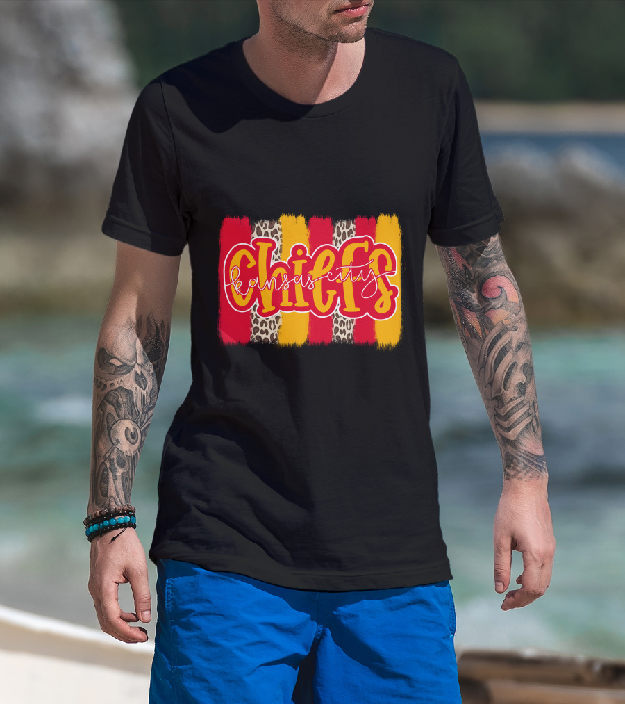 The Kansas City Chiefs Handlettered Red Gold Leopard Stripes T-shirt is designed for everyday wear and a consistent fit. Fabric is pre-shrunk ring-spun cotton with durable stitching. See the size chart below for exact measurements.
