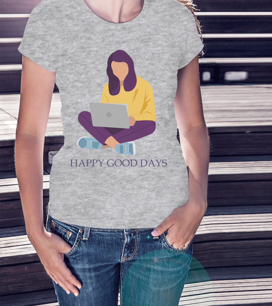 The HAPPY GOOD DAYS Laptop Sitting Woman T-shirt is designed for everyday wear and a consistent fit. Fabric is pre-shrunk ring-spun cotton with durable stitching. See the size chart below for exact measurements.